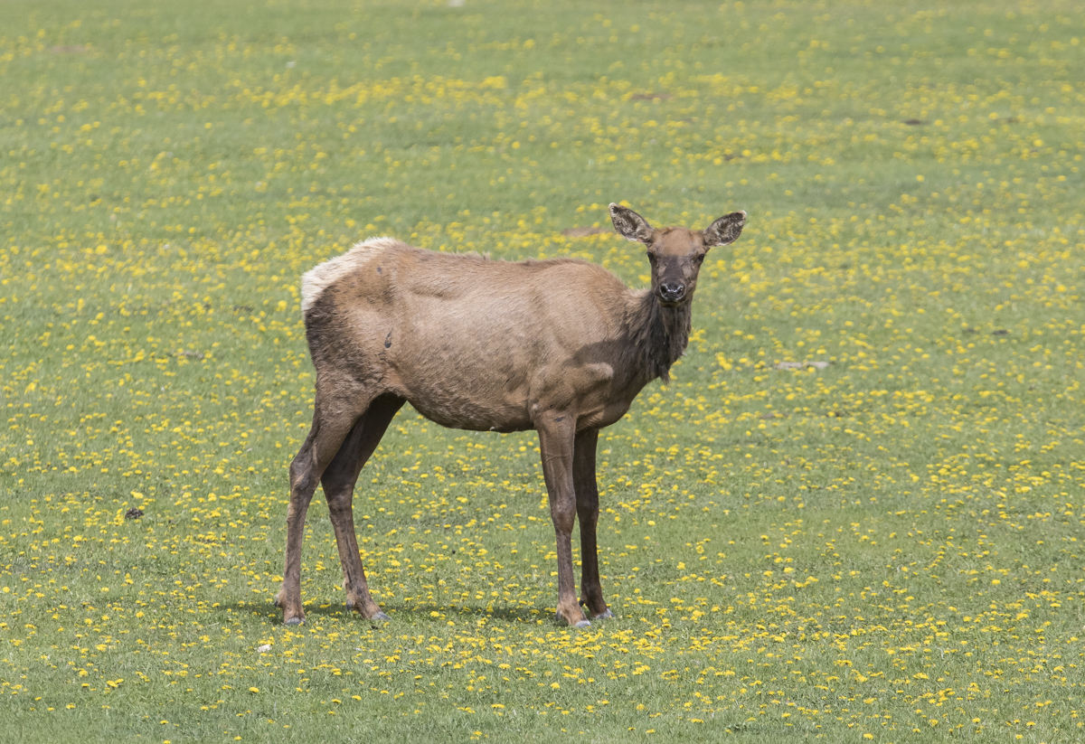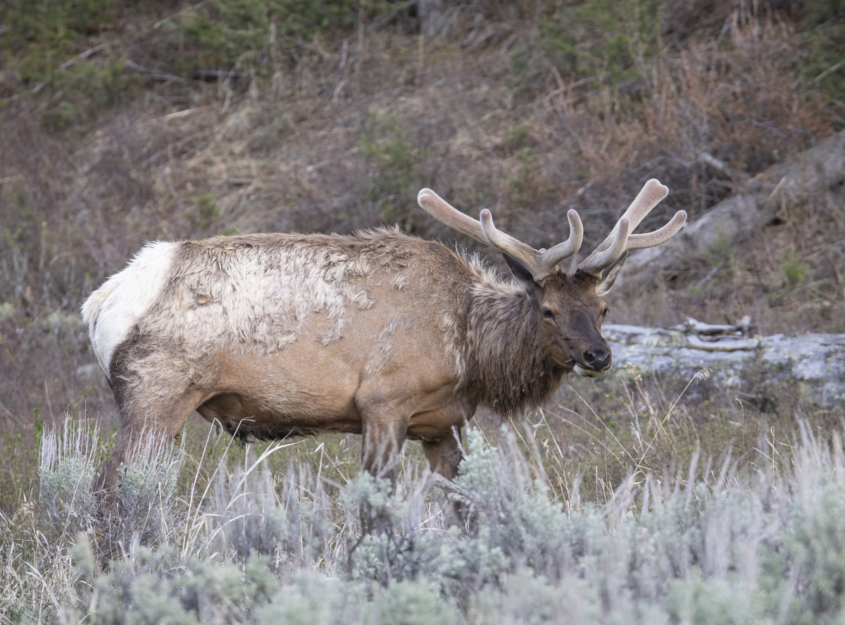 We called our friend, Beth, an education ranger in the park, to try to arrange a short visit. We met her at the old schoolhouse in Mammoth Hot Springs where she was wrapping up a meeting. A few cow Elk were grazing in the lawn (Mammoth is one of the best places in the park to see Elk). Beth had seen a calf with one of the cows before we arrived, but when we went around to the back of the building, it was nowhere to be found, no doubt hidden in the sparse sagebrush on the hill. When we rounded the corner, one cow raised her head and stared at us and then glanced up the hill, probably in the direction of her hidden calf. We stood and talked for several minutes and the cow resumed grazing, occasionally looking our way and back up the hill. I kept scanning the slope and finally found the calf, given away only by a flick of its ear.