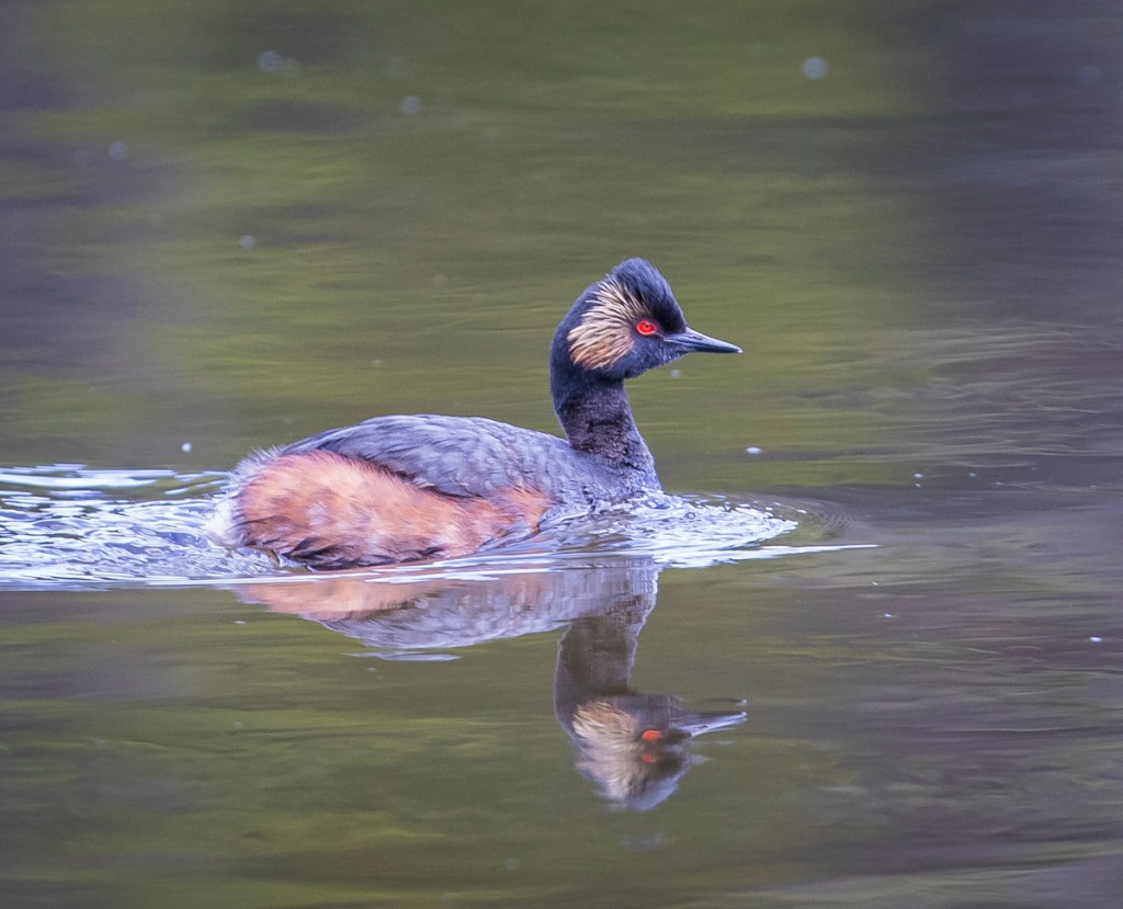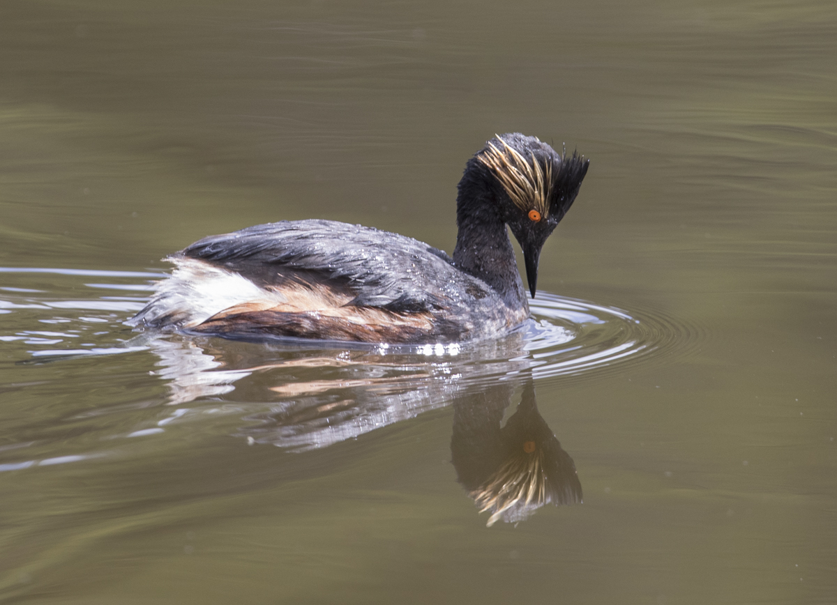 So, that was our experience in the Tetons, bad weather, beautiful scenery, and hordes of visitors. We anticipated even larger crowds at Yellowstone, but were pleasantly surprised. After a few stops to take in some scenic views, we pulled over along the Yellowstone River to try to photograph one of my favorite birds in the park, Eared Grebes. A stunning bird, with their dark plumage, golden ear swag, and scarlet red eyes, Eared Grebes are known nesters in the park. This was a group of a dozen or so swimming upstream in the river. Most of them had their heads tucked and their rump feathers raised (which is one way they increase their body temperature, allowing sunlight to reach their dark skin beneath the feathers). Below the waterline, their legs were paddling away to help maintain their position or move them slightly upstream over time. We sat down on a boulder upstream of the birds and waited, taking way too many photos as they gradually swam past us.