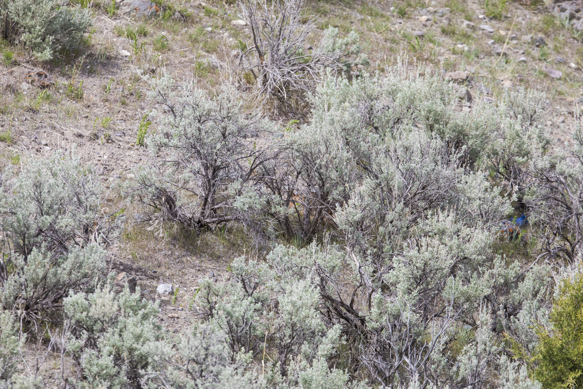 The next morning, as we drove through Lamar, we could not believe how few cars we saw. This was Saturday of Memorial Day weekend in one of the most popular parks in the nation, and the pullouts in Lamar Valley were virtually empty! We stopped and enjoyed watching a sow Grizzly and two cubs of the year playing and rolling on a snow bank on a high ridge across the valley (spotting scopes are a must in Lamar). Someone else with a scope mentioned seeing a Gray Wolf on the shoreline of the river across the valley. We scanned, and sure enough, a collared wolf was tugging at a carcass (probably a bison). For the next 15 minutes or so the wolf pulled off chunks of meat with a squadron of Ravens overseeing the operation. When she was done, she began to trot across the valley in our direction, and toward where we knew the wolf den at Slough Creek was located, about 3 miles behind us. Based on online images of collared wolves of the Junction Butte Pack, we think this was the female wolf called 907F. Once the alpha female, she has been replaced in that pack position by another wolf.