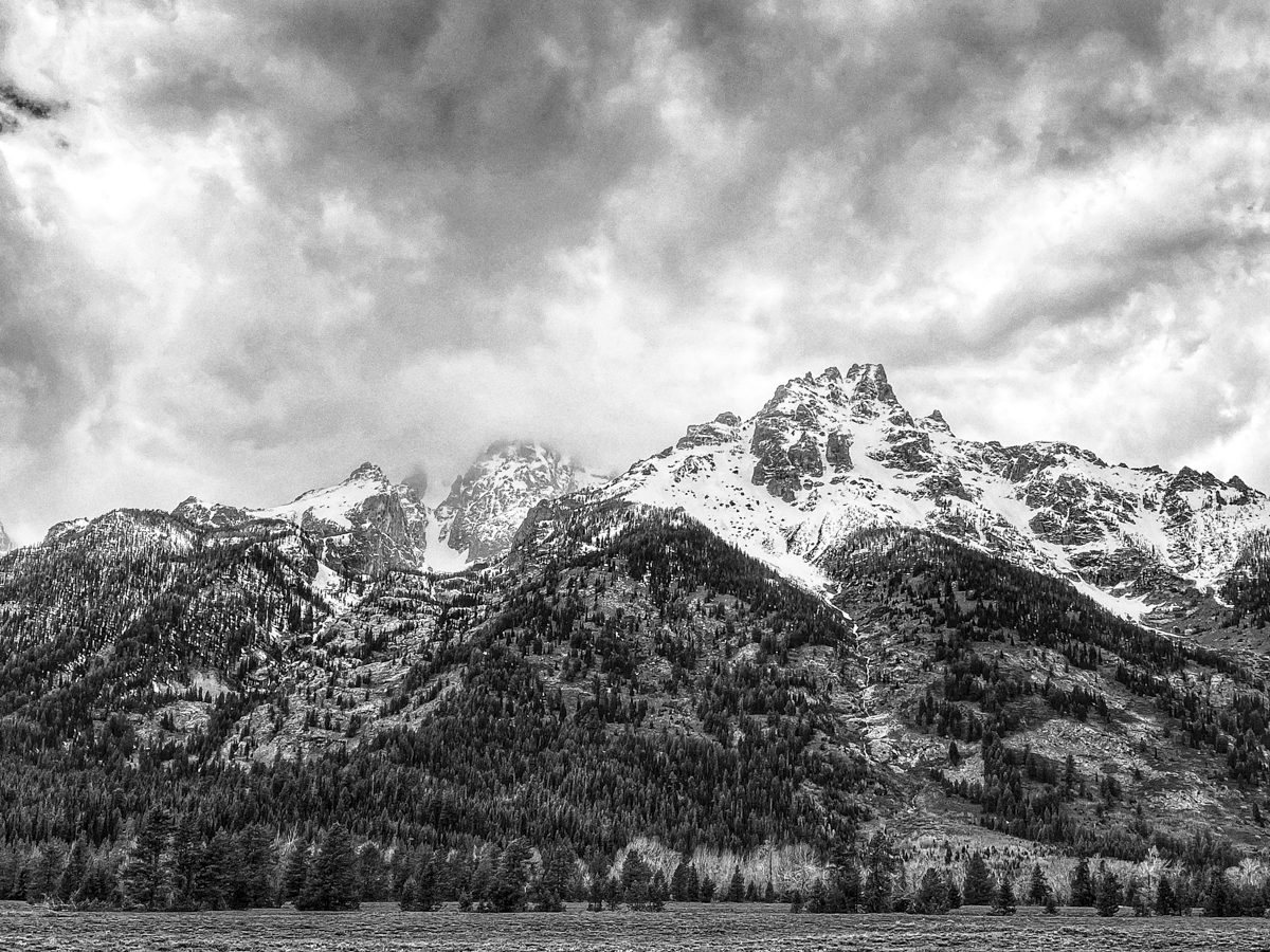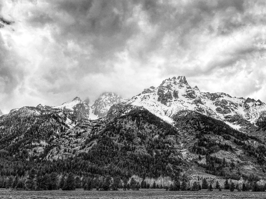 The Tetons are majestic even in gray skies (black and white photo) – click photos to enlarge
