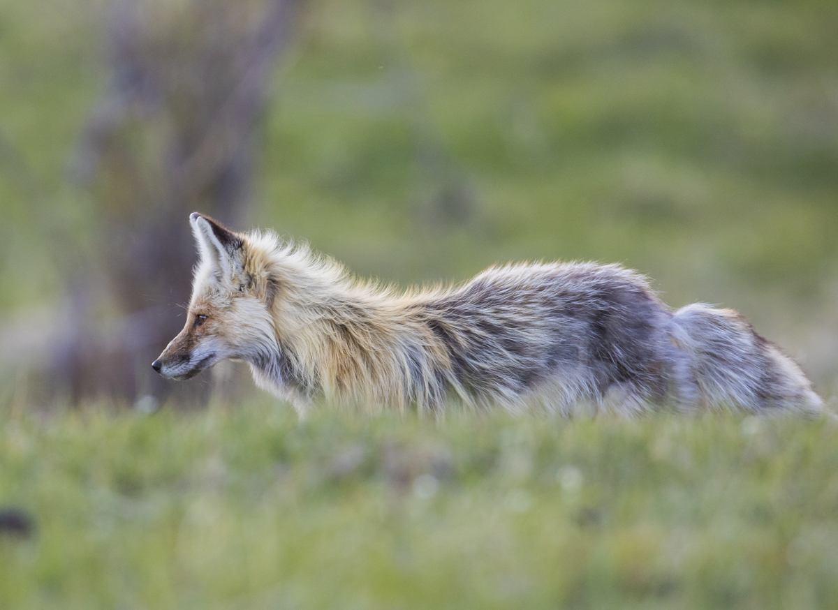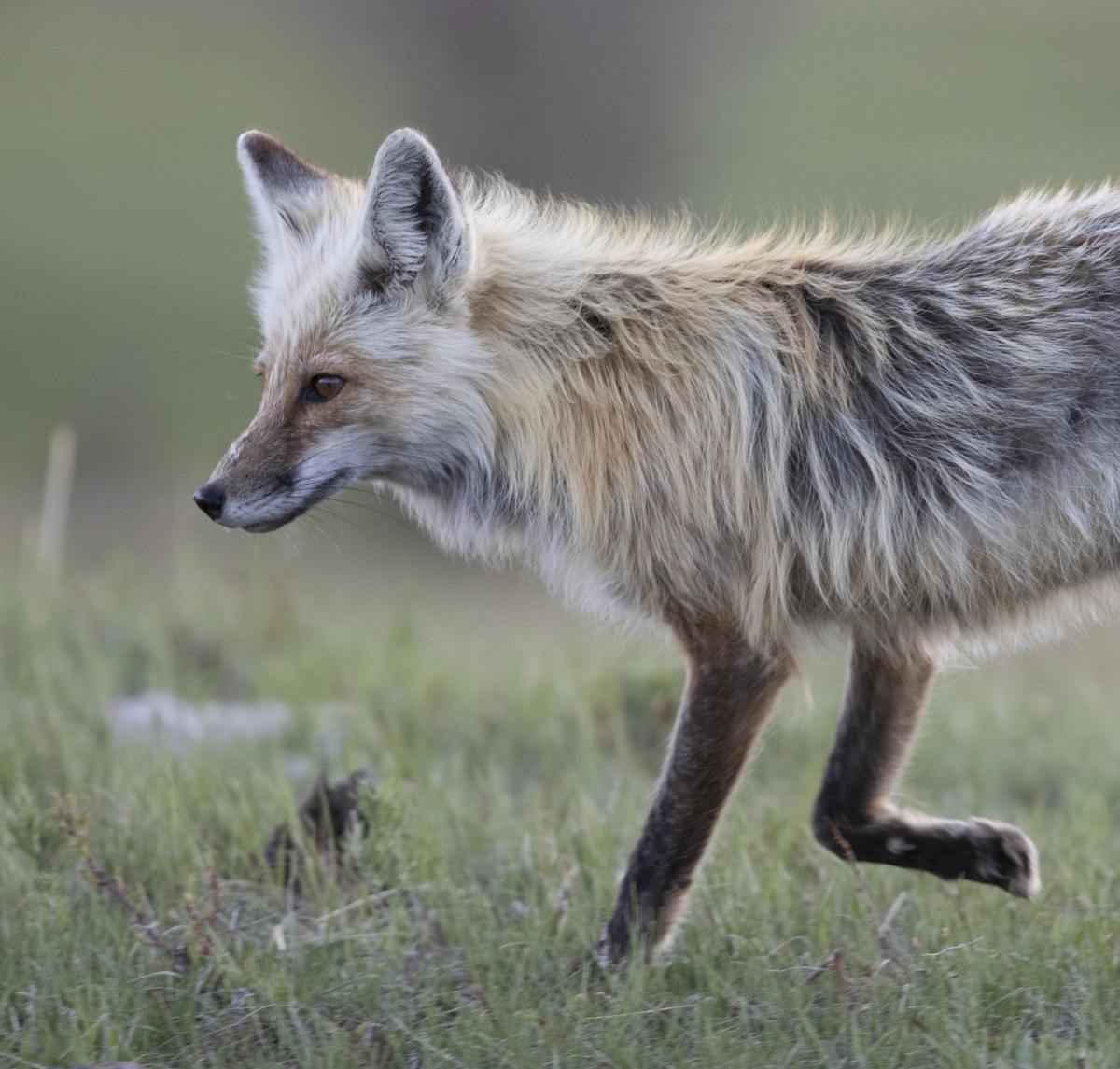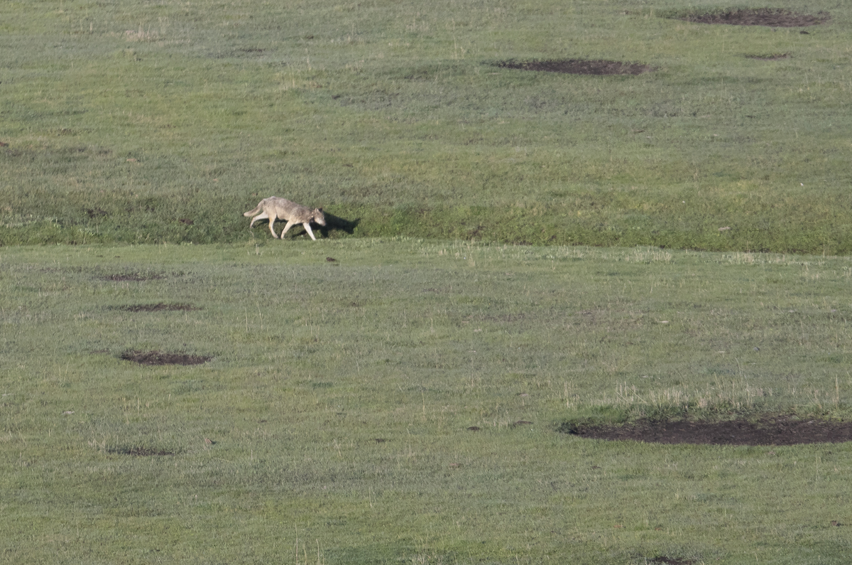 Passing through Little America and into Lamar Valley feels like being home. We had been in the park for only a few hours and already seen Coyotes, Wolves, Elk, Bison, Grizzly Bears, Black Bears, Pronghorn, Mule Deer, Rocky Mountain Bighorn Sheep, Rocky Mountain Goats, and lots of birds from Ravens to Bald Eagles. And, to our surprise, there were no crowds! As we drove through the upper end of Lamar Valley, a car going in our direction in front of us was driving slowly on the opposite side of the road. It was following what I at first thought was a Coyote off the side of road, down a slight incline. As we got closer, I realized it was a pale-colored Red Fox (giving us a “3 Dog Day” – seeing all three of Yellowstone’s canid species in one day). I attempted a pic as we drove by, but didn’t want to stop in the middle of the road with other cars nearby. We continued down the road about a half mile and pulled out at a parking area. We got out and walked over to a low ridge overlooking a small stream. We were still within sight of the road, should the fox continue along that route. The fox was trotting along at a good pace and then crossed to our side of the road and took a path along the stream. It stopped and caught a small mammal of some sort and ate it, and I figured it would continue along the waterway, looking for more furry snacks. But, it crossed over and disappeared beneath the crest of the ridge we were on. Suddenly, it popped up just below us. It paused, glanced our way, and then continued along the ridge line, passing within about 20 feet of us, seemingly unconcerned.
