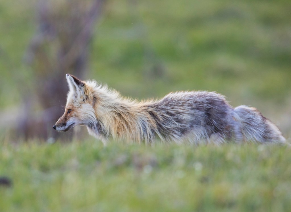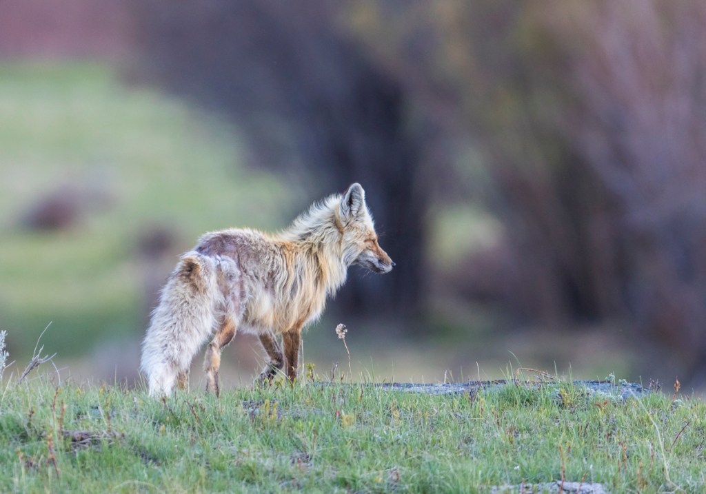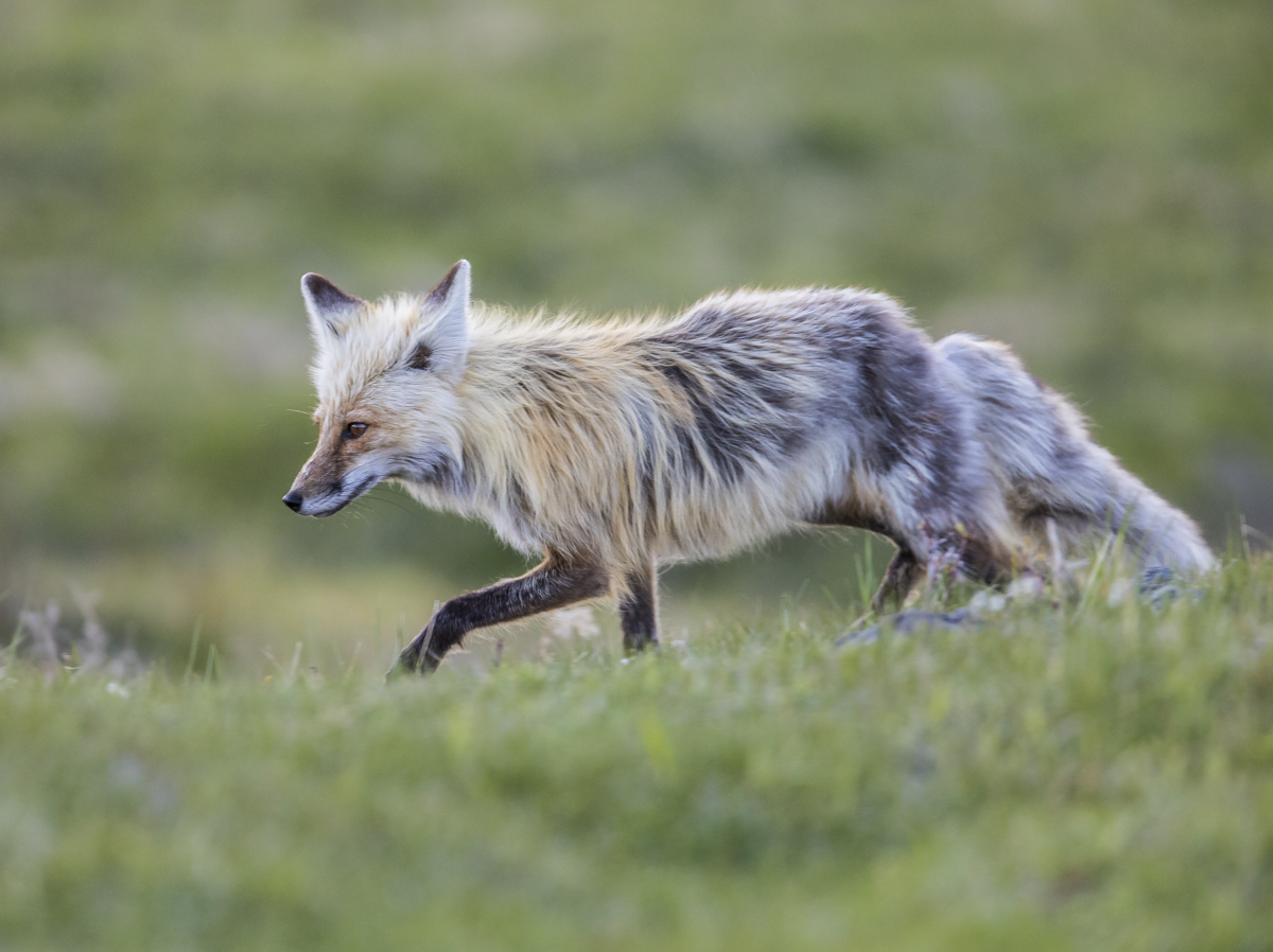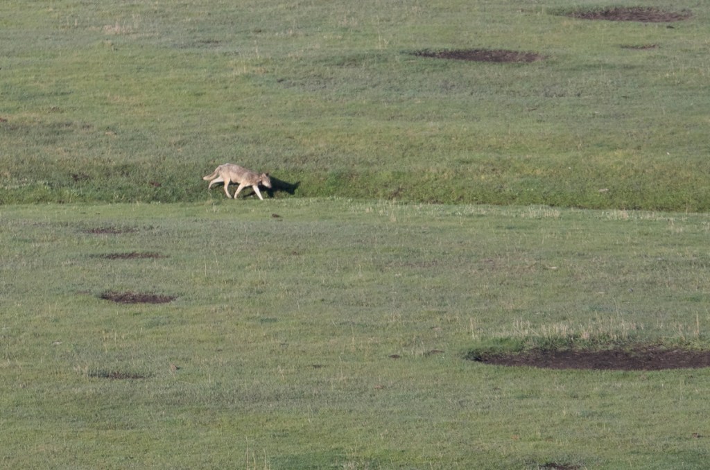 Passing through Little America and into Lamar Valley feels like being home. We had been in the park for only a few hours and already seen Coyotes, Wolves, Elk, Bison, Grizzly Bears, Black Bears, Pronghorn, Mule Deer, Rocky Mountain Bighorn Sheep, Rocky Mountain Goats, and lots of birds from Ravens to Bald Eagles. And, to our surprise, there were no crowds! As we drove through the upper end of Lamar Valley, a car going in our direction in front of us was driving slowly on the opposite side of the road. It was following what I at first thought was a Coyote off the side of road, down a slight incline. As we got closer, I realized it was a pale-colored Red Fox (giving us a “3 Dog Day” – seeing all three of Yellowstone’s canid species in one day). I attempted a pic as we drove by, but didn’t want to stop in the middle of the road with other cars nearby. We continued down the road about a half mile and pulled out at a parking area. We got out and walked over to a low ridge overlooking a small stream. We were still within sight of the road, should the fox continue along that route. The fox was trotting along at a good pace and then crossed to our side of the road and took a path along the stream. It stopped and caught a small mammal of some sort and ate it, and I figured it would continue along the waterway, looking for more furry snacks. But, it crossed over and disappeared beneath the crest of the ridge we were on. Suddenly, it popped up just below us. It paused, glanced our way, and then continued along the ridge line, passing within about 20 feet of us, seemingly unconcerned.