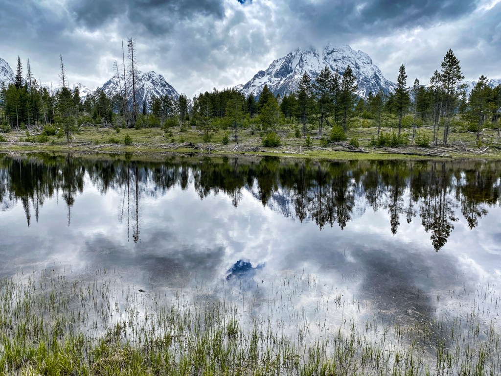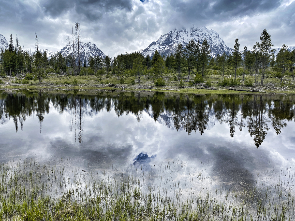 This is the next to last in the series of reports on our truck camping trip in the month of May. No surprise to those that know us, we ended up heading toward Yellowstone by way of Grand Teton National Park, staying with friends that have recently moved to Jackson. Sam and Bright are wildlife watchers and photographers extraordinaire so it was great hearing about their plans and the many incredible things they have observed after moving west this spring. Unfortunately, the weather was not cooperating as we headed out the next morning in conditions of gray skies, occasional rain and snow flurries, and lots of visitors on the park roads.