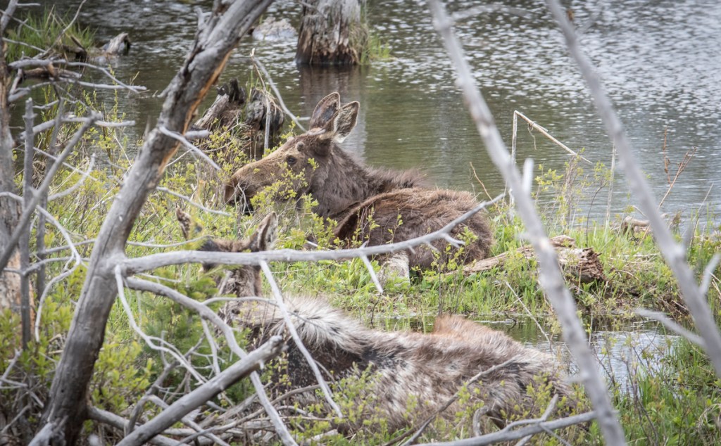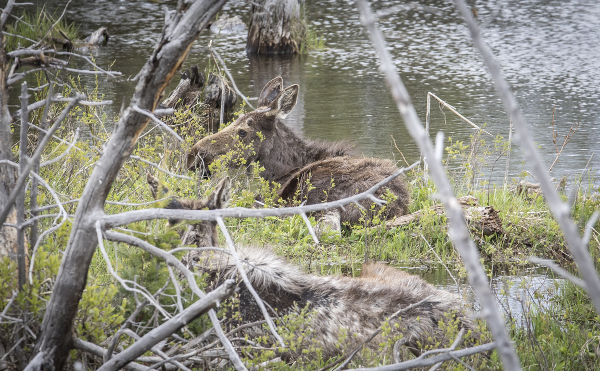 We spent the one full day in the Tetons going down some familiar roads looking for wildlife and then exploring a few dirt roads we had never traveled. A pair of Moose were being watched by 50+ people near Taggart Lake, so we stopped to take a look.