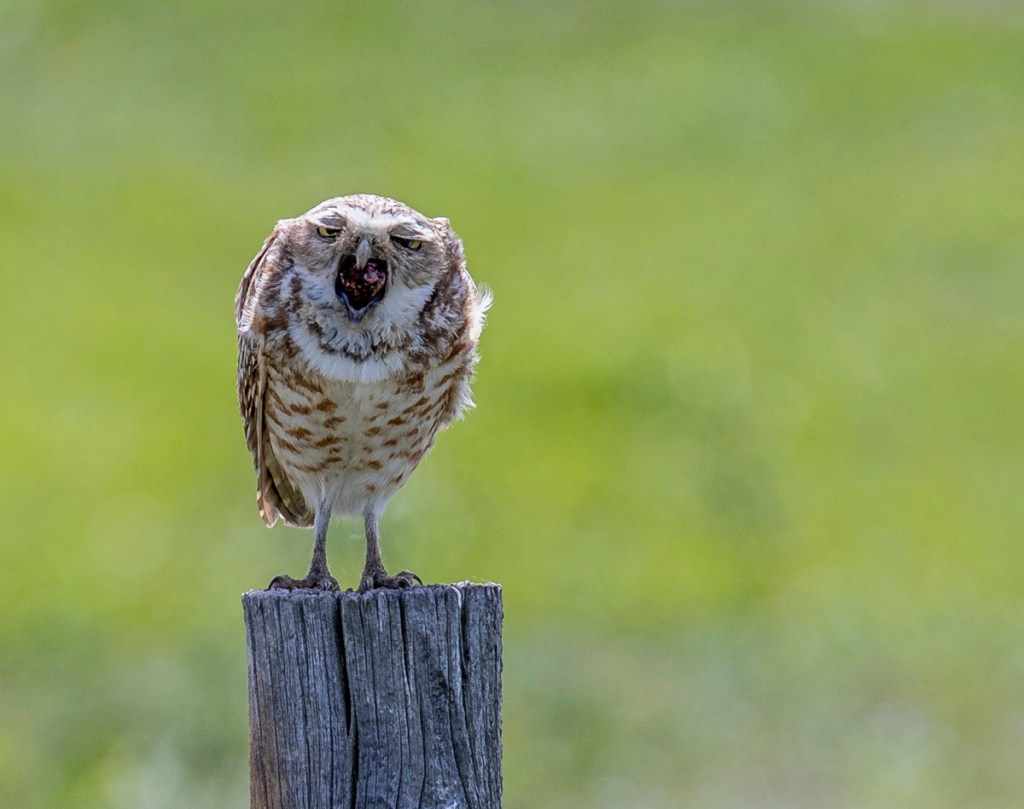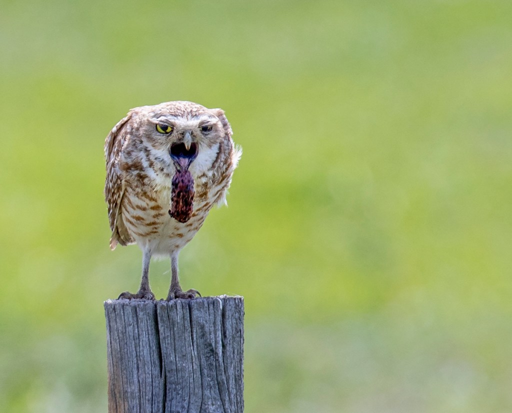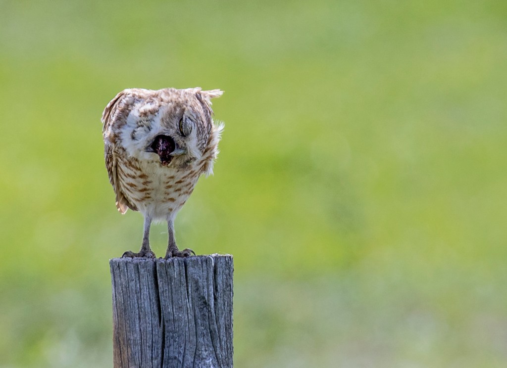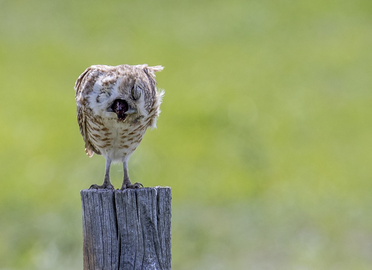 Now the owl was much closer and on Melissa’s side. She started taking pics as the bird looked our way. I was trying to hold my telephoto and shoot past her head, but it was tough. Luckily, she caught an amazing sequence of what the owl did next. It leaned forward and looked like it was gagging and then up came a pellet!