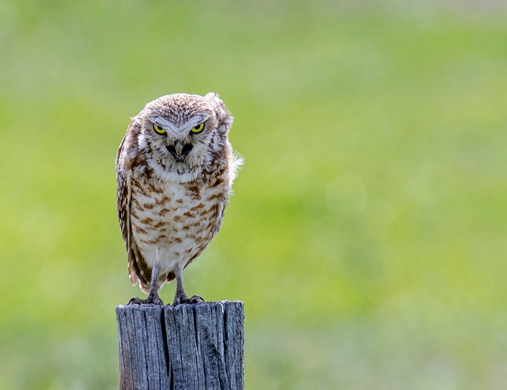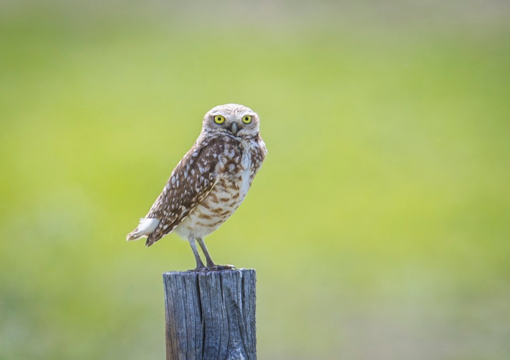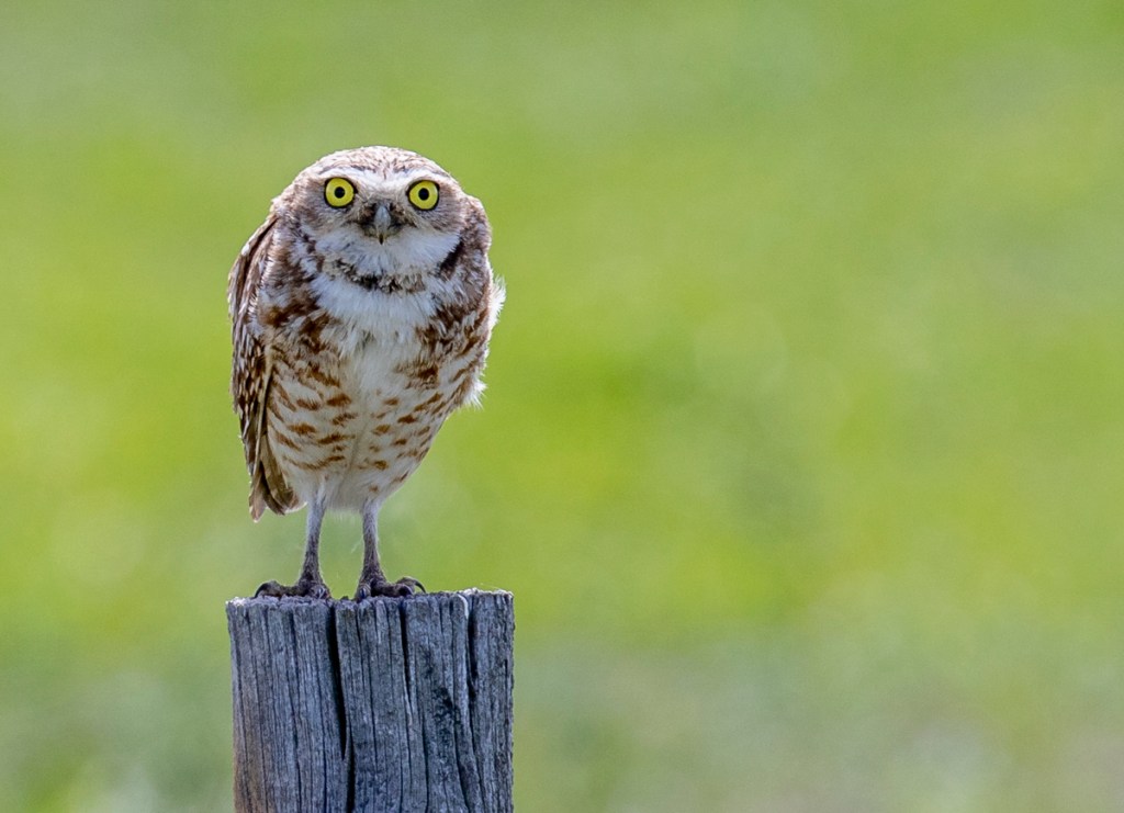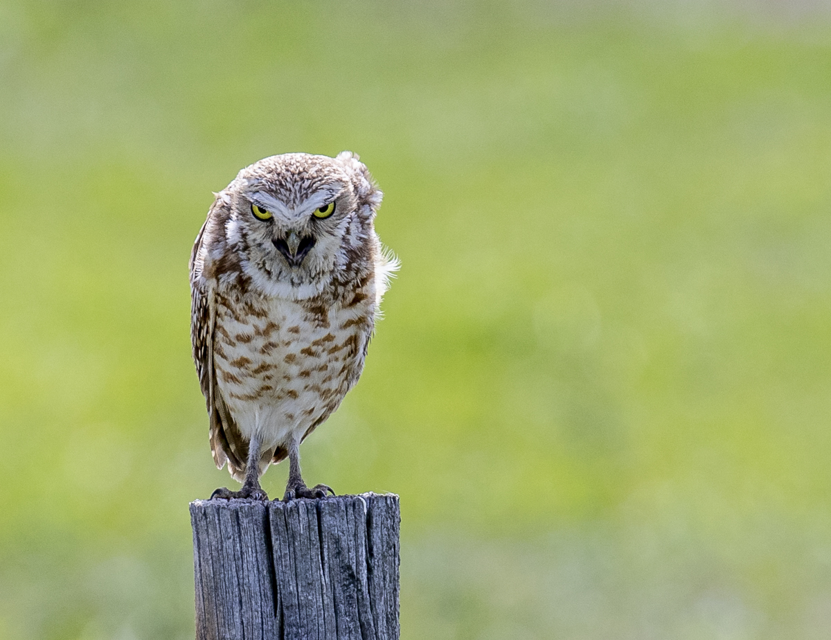 There were so many prairie dog towns along this route and some were huge with what looked like hundreds of mounds. We had discussed looking for Burrowing Owls when we saw prairie dog habitat as these diminutive birds frequently use abandoned prairie dog burrows as roost and nest sites. Burrowing Owls range from Canada to Mexico and parts of Central and South America. There are populations in Florida and some islands in the Caribbean as well. Throughout much of their range, their numbers are declining due to habitat loss and decline in the populations of burrowing mammals. We kept scanning as we drove, but I finally pulled over at a large roadside prairie dog town and told Melissa to find me an owl. Lo and behold, after only a couple of minutes, she spotted one. It was way back away from the road sitting on a mound.
