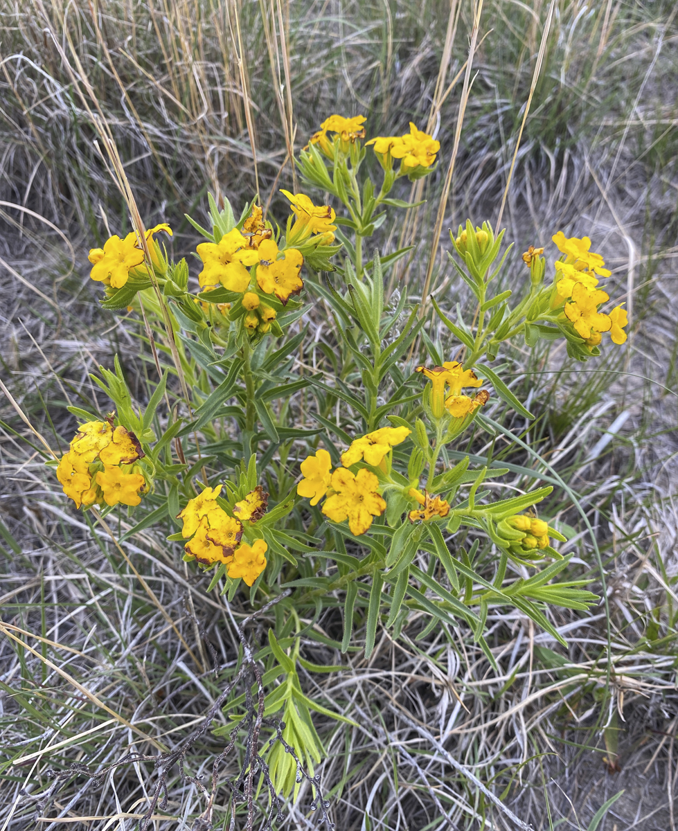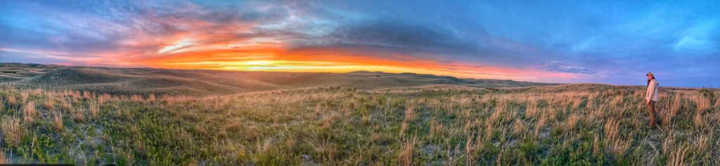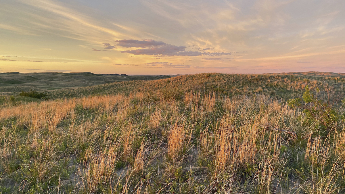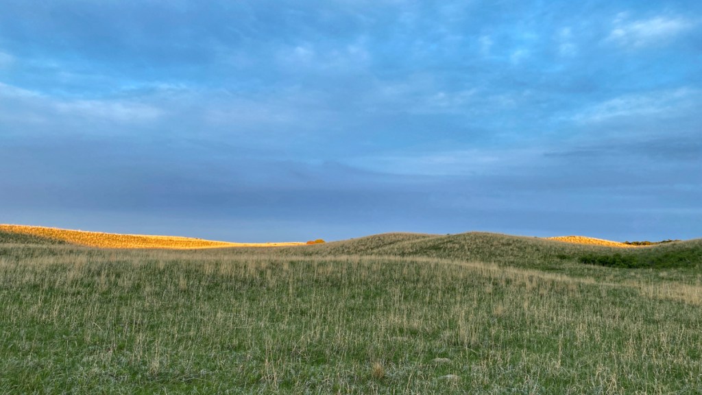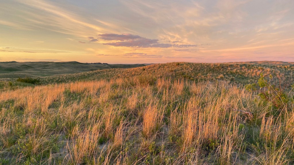 Melissa guided us to Samuel R. McKelvie National Forest in the north-central Sandhills region of Nebraska. There really aren’t that many “forests” here (except for a Ponderosa Pine forest planted many years ago) but plenty of expansive rolling grasslands and an amazing abundance of ponds and lakes. In fact, there were temporary signs all along the route indicating high water may be on the road. That had us a little worried about mosquitoes, but we found the non-biting midges to be the dominant insect as we looked for a non-flooded refuge road to take for a campsite. We finally found one late in the day and set up camp in a small gap between high grass-covered dunes. Once again, we found the Sandhills are apparently maintained by grazing cattle and our site had plenty of evidence that cows had frequented the area (luckily, there were none anywhere nearby at that time). But there were plenty of wildflowers and a surprising amount of poison ivy scattered about, so we took our time walking up the hill above camp. Once on top, a fantastic vista unfolded of seemingly endless rolling grasslands bathed in the golden fading daylight.