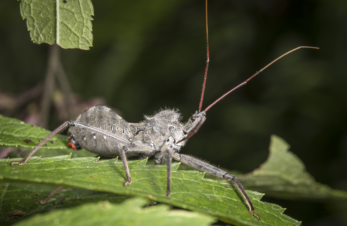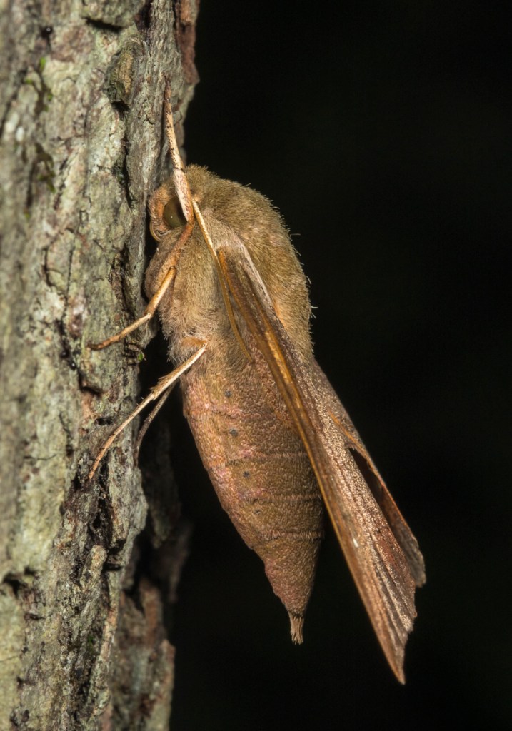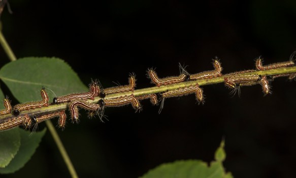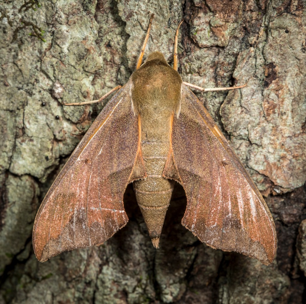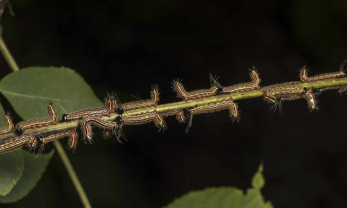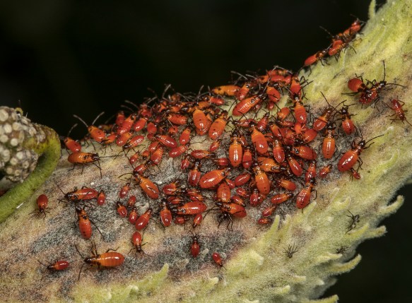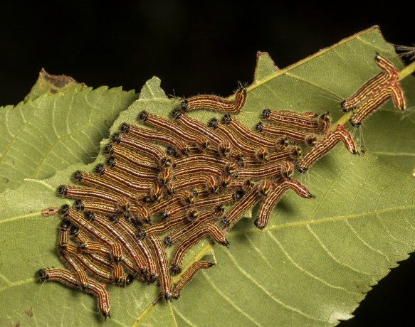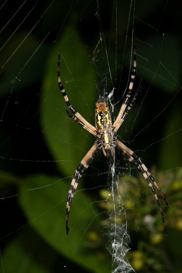 Virginia Creeper Sphinx (aka Hog Sphinx), Darapsa myron (click photos to enlarge)I captured, transported, and released this sphinx moth here in the woods after finding it at our bank in Pittsboro, lured under the walkway by the lights at night. Urban (really, any) lights are a common cause for the demise of many a moth.A formidable-looking Wheel Bug, Arilus cristatus. This is a large member of the group of insects called Assassin Bugs, due to their predatory behavior. They grab prey (other insects) with their raptorial front legs, pierce them with that large rostrum (reddish beak under the head), inject a toxin with digestive enzymes, and then ingest the contents.Red-banded Leafhopper, Graphocephala coccinea.These tiny (~7mm) insects feed on the sap of leaves and can spread a bacterium that causes leaf scorch disease (Pierce’s disease) on some species of plants. They are excellent hoppers, with some believed to jump up to 40x their body length (a 6 ft human of equal ability could jump 240 feet!).A dark morph female Eastern Tiger Swallowtail, Papilio glaucus. Females of this species can be either black or yellow.A male Eastern Tiger Swallowtail. Note that females (see picture above) are more colorful than males, having more blue along the hind wings.A group of Datana sp. caterpillars in their defensive posture (they exude distasteful chemicals from both ends)Datana sp. larvae typically are gregarious through most of their life stages. I guess if one tastes bad, a whole bunch must be a better deterrent.Another bad-tasting bunch-o’-bugs – nymphs of Large Milkweed Bugs, Oncopeltus fasciatus. I photographed a mating pair of adults on this milkweed plant on July 22 and this photo was taken on August 7. This species feeds on milkweed seeds by injecting saliva into the seed using their long rostrum, which predigests the seed so they can suck the contents back up. Female Yellow Garden Spider, Argiope aurantia. She has grown considerably since I last photographed her on July 22.And she has acquired a suitor. This male Yellow Garden Spider is in a web right behind that of the much larger female (you can see the tips of her legs on the left side of the photo)One of our more unusual-looking spiders, the bizarre Spined Micrathena, Micrathena gracilis. Females have a large bulbous abdomen adorned with spines. They are quite common in our woods in late summer.Another armored spider, the Spiny Orbweaver, Gasteracantha cancriformis. Females have a rotund body that is white to yellow in color. The abdomen is surrounded by six stout spines that can be red or black. Their webs have tufts of silk along some strands, supposedly making them visible to birds which will avoid flying through them (and me, to avoid getting them on my face with all the other spider webs along our trails).