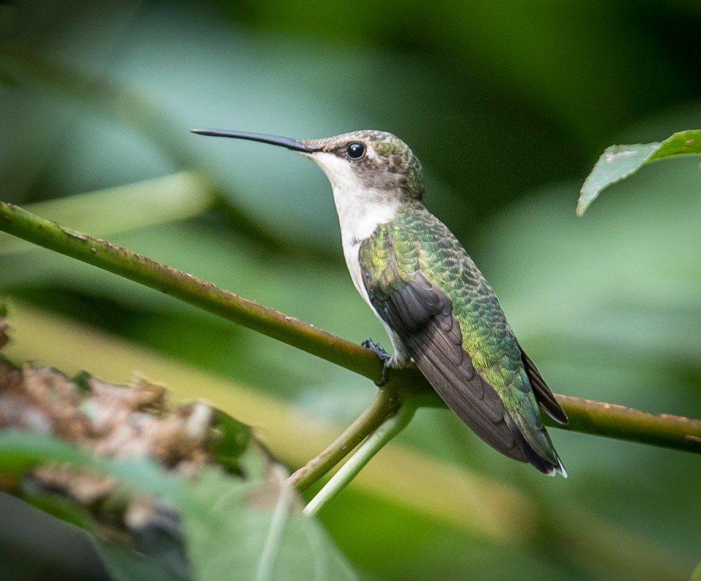 With a thunderstorm kicking up outside and rain (much needed rain) starting to fall, I sit inside watching the yard missiles go at each other at the four feeders we have scattered around the house. It still baffles me how their daily energy budget balances out in their favor with all the zest and fury that they exhibit for most of the day. The calmest feedings occur when I am outside near one of the feeders, apparently keeping at least one of the bejeweled jets at bay (although this doesn’t always hold true). They also tend to dine unbothered when they sneak into the yard vegetation and partake of sips of nectar from the lone surviving Cardinal Flower (a favorite of the yard bunnies I’m afraid) or the abundant Jewelweed. We have plenty of the latter growing just outside our kitchen/sun-room window. I love this up close jungle because it allows me to watch our hummingbirds as they deftly maneuver through the tangle in search of the bright orange flowers. It also gives us a great view of the many butterflies and other insects that visit the nearby Joe-Pye-Weed and Ironweed. The recent appearance of a pair of Green Treefrogs clinging to the look-alike plant stems is an added bonus.