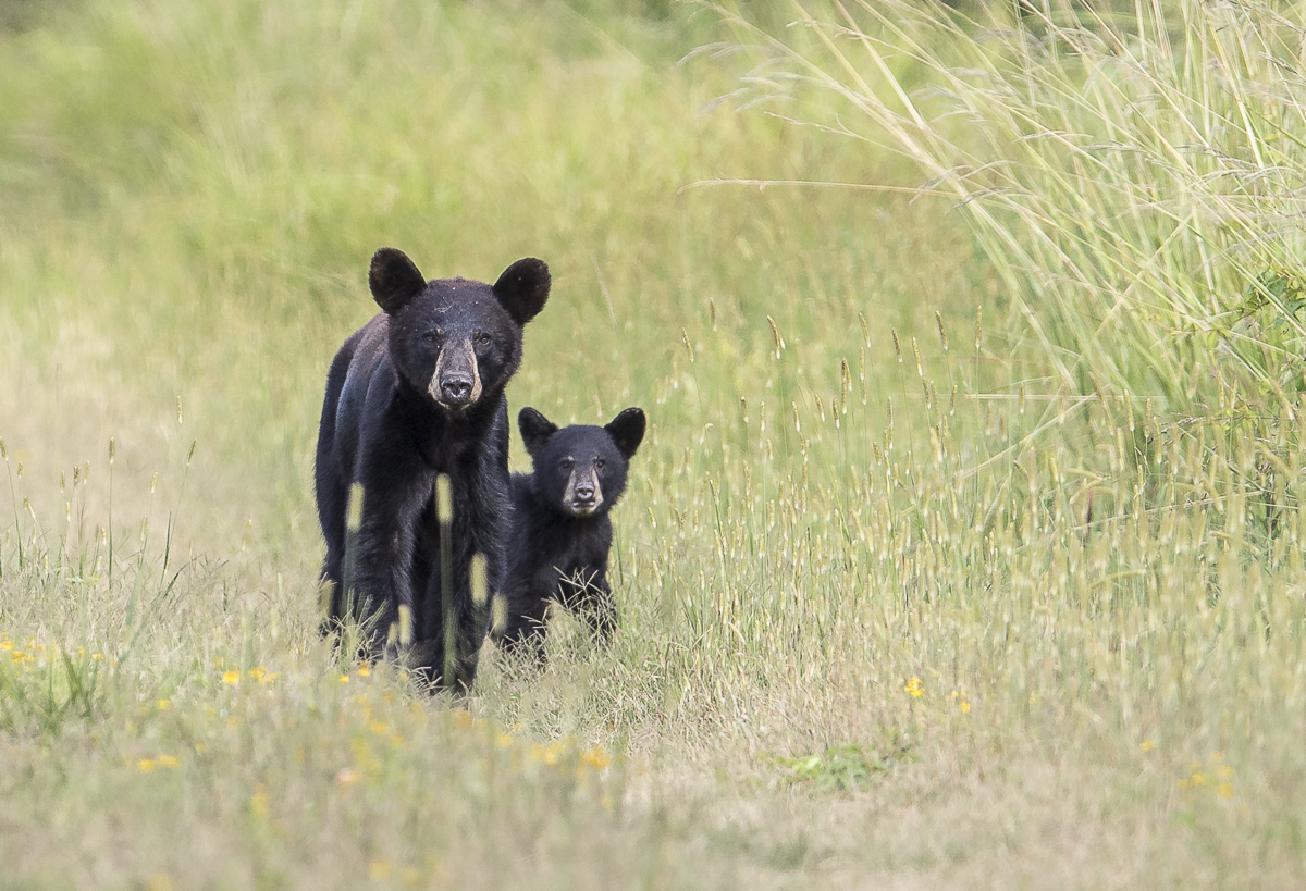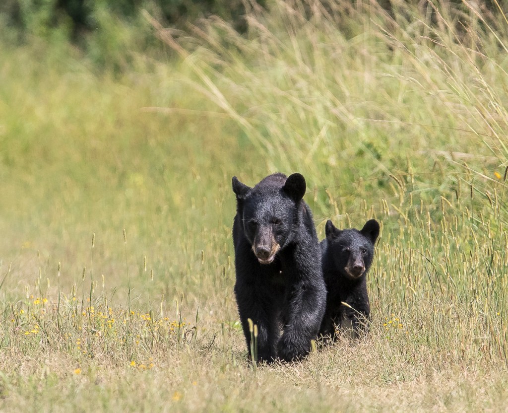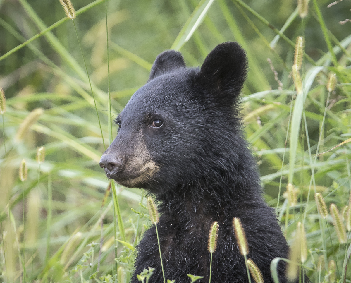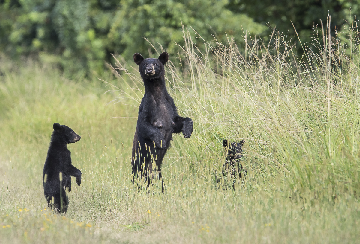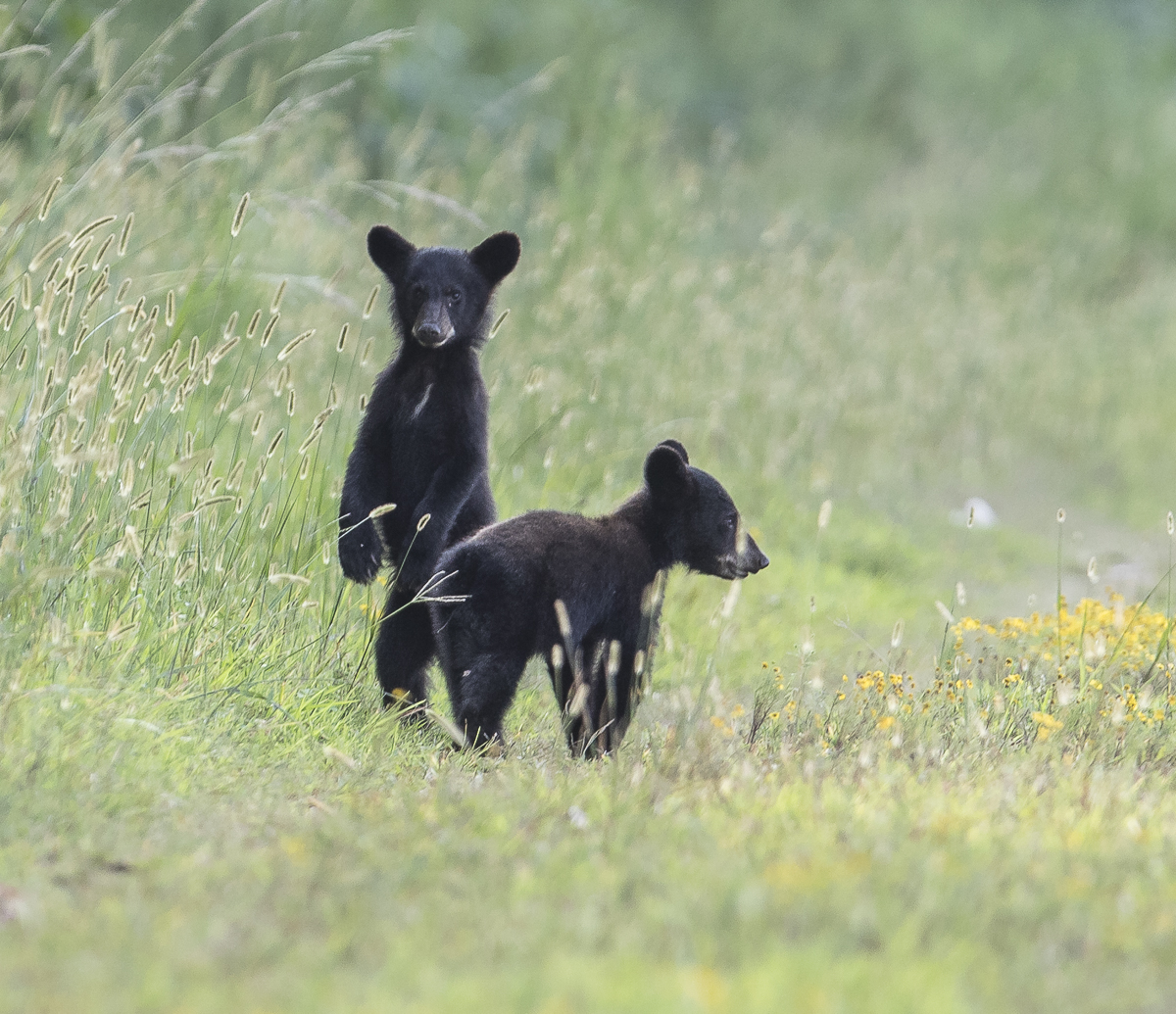 I spotted three bears crossing into or out of the field within 15 minutes of being there. Things settled down and I waited another half hour before a young sow and lone cub of the year (COY) appeared far down the road, walking my way. She was steadily moving toward me with the cub stopping, then scrambling to catch up. At one point she stood up briefly, looking my way, but probably unsure of what I was. I was sitting along the edge of the road but not in the tall grasses due to the abundance of poison ivy, so i wasn’t particularly hidden. I expected her to do what most bears (especially those with cubs) do, and head into the safety of the woods and either attempt to wait me out or go beyond me before coming back out into the road. But, she didn’t, she just kept coming.