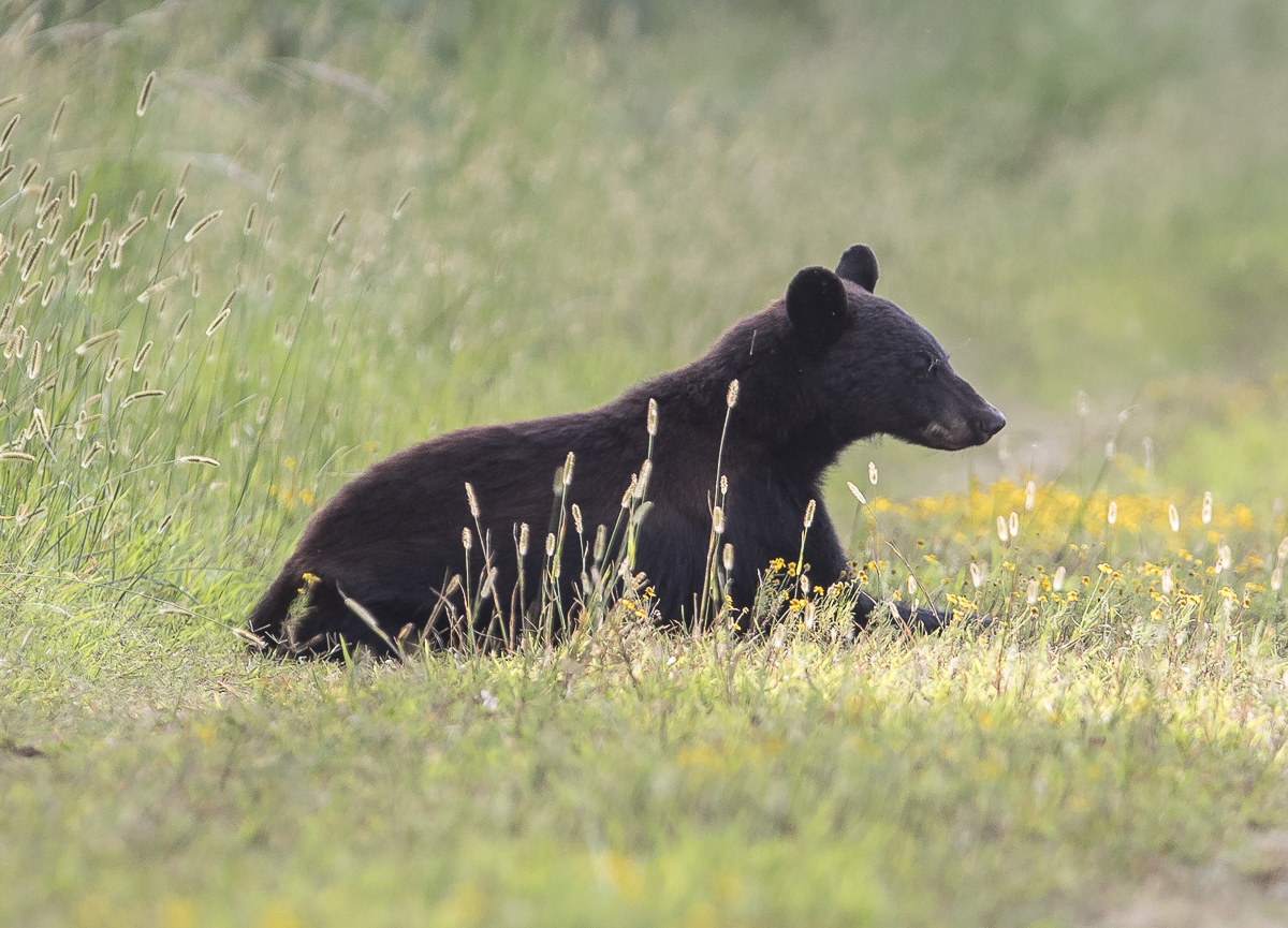 Some other bear watchers showed up and I soon found myself exchanging pleasantries with three people on E-bikes (the apparent new rage for wildlife photographers on the eastern refuges). Four other people hung back at the gate and watched. I decided it was time to move on, but another bear appeared far down the road before I could get packed up. It did something strange and came out of the woods, and walked around several times, sniffing, and then laid down in the road. It remained there for several minutes, yawned a few times, then got back up and moved across into the tall vegetation to swim the canal. As it disappeared into the tall grasses, two COYs came streaking out of the woods to join her.
