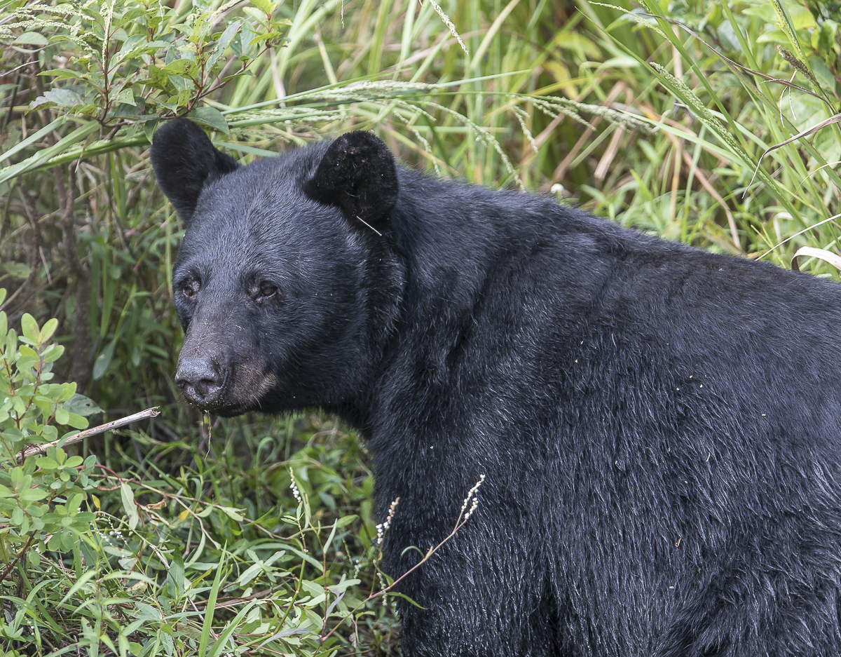 When I stepped through the vegetation, my eye caught movement on the opposite side of the canal. There were two of us surprised by this encounter…me (sans camera) and a very large boar Black Bear. I slowly moved back to retrieve my camera, and he grudgingly left the water and ambled back into the vegetation, giving me one glance before slinking off and disappearing into the thick greenery. That was bear #3 of the morning, but the closest by far.