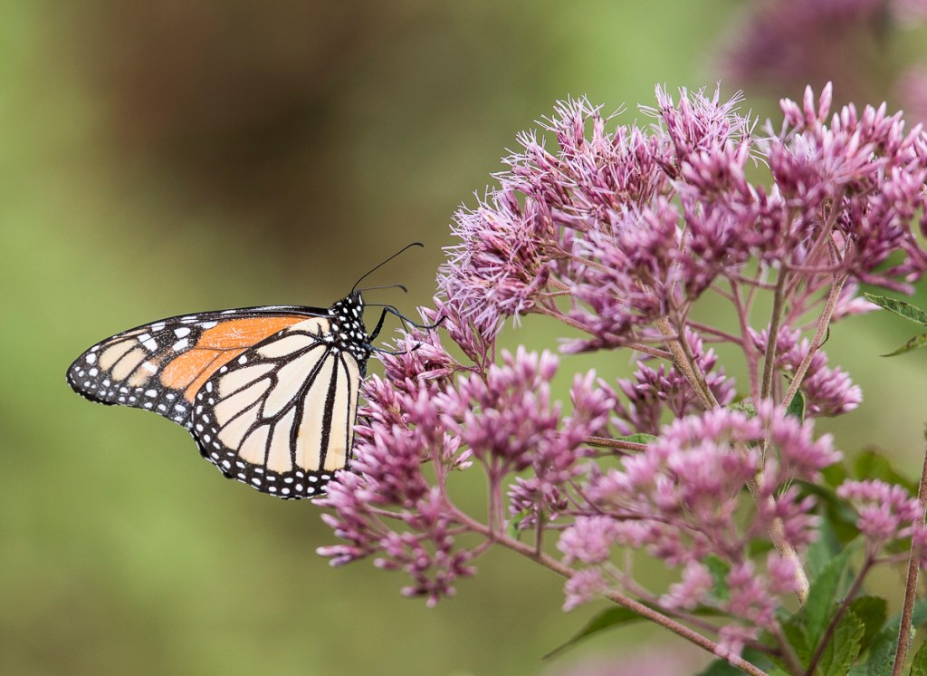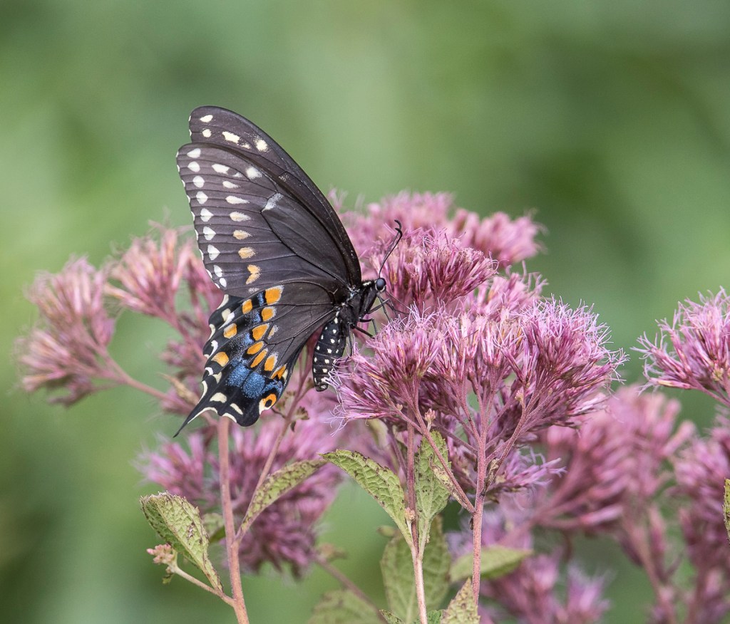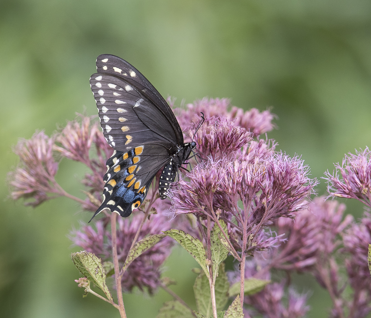 I got out and walked along some of the grassy roads, looking for bears and observing the many wildflowers and butterflies. I saw several fresh-looking Monarchs, no doubt on their long journey to Mexico. The beautiful Three-nerved Joe-Pye-Weed was a favorite nectar stop for many species. I wonder if that species of Joe-Pye would do well in our yard? It blooms later, is shorter than the one we have by a couple of feet, and is a darker pink in color.
