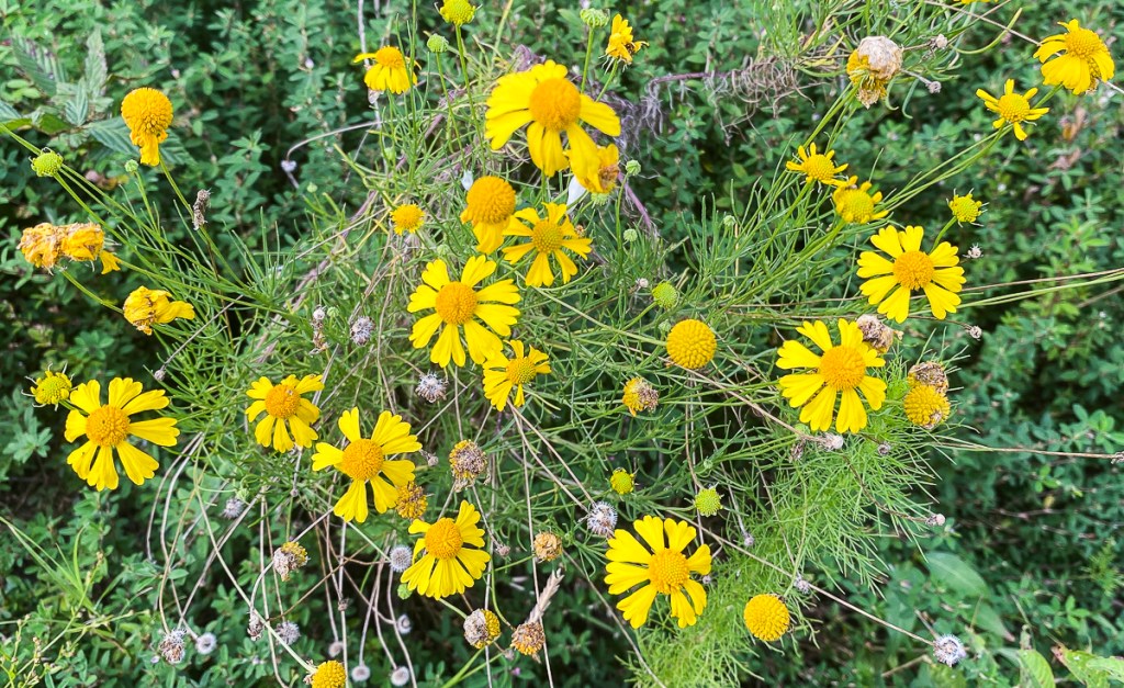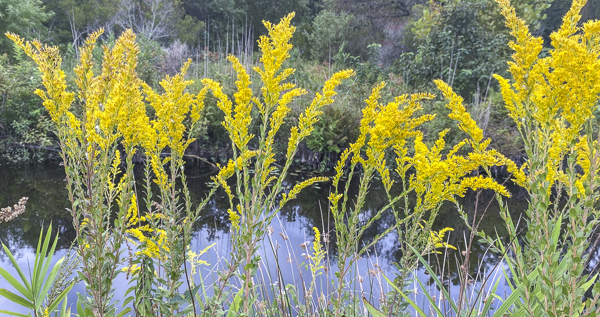 With my eyes trained on finding the small things hidden in the roadside vegetation, I spotted an otter trail going into the canal through some tall weeds, so I set my camera and telephoto lens down and walked a few feet to peer over the canal bank and photograph some of the goldenrod’s intense yellow flowers with my phone.