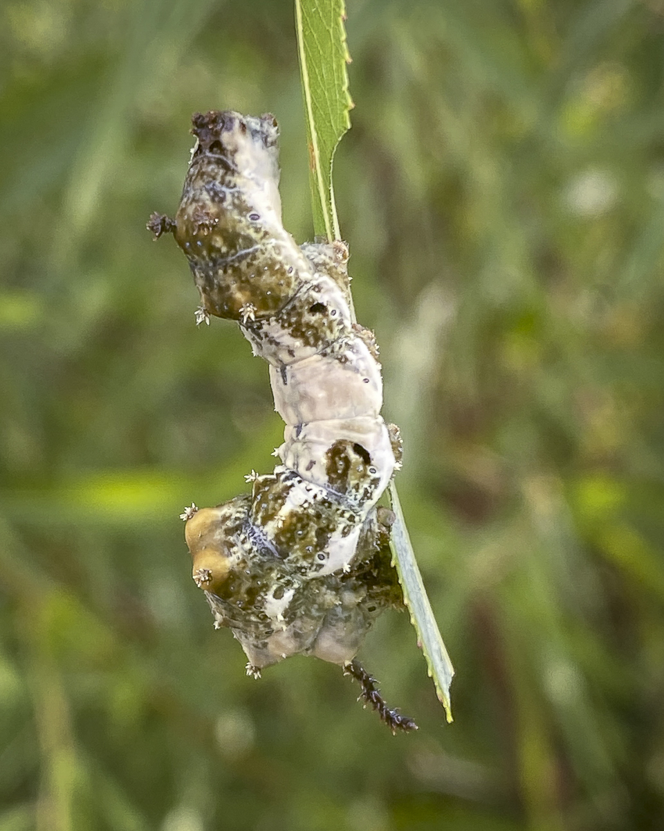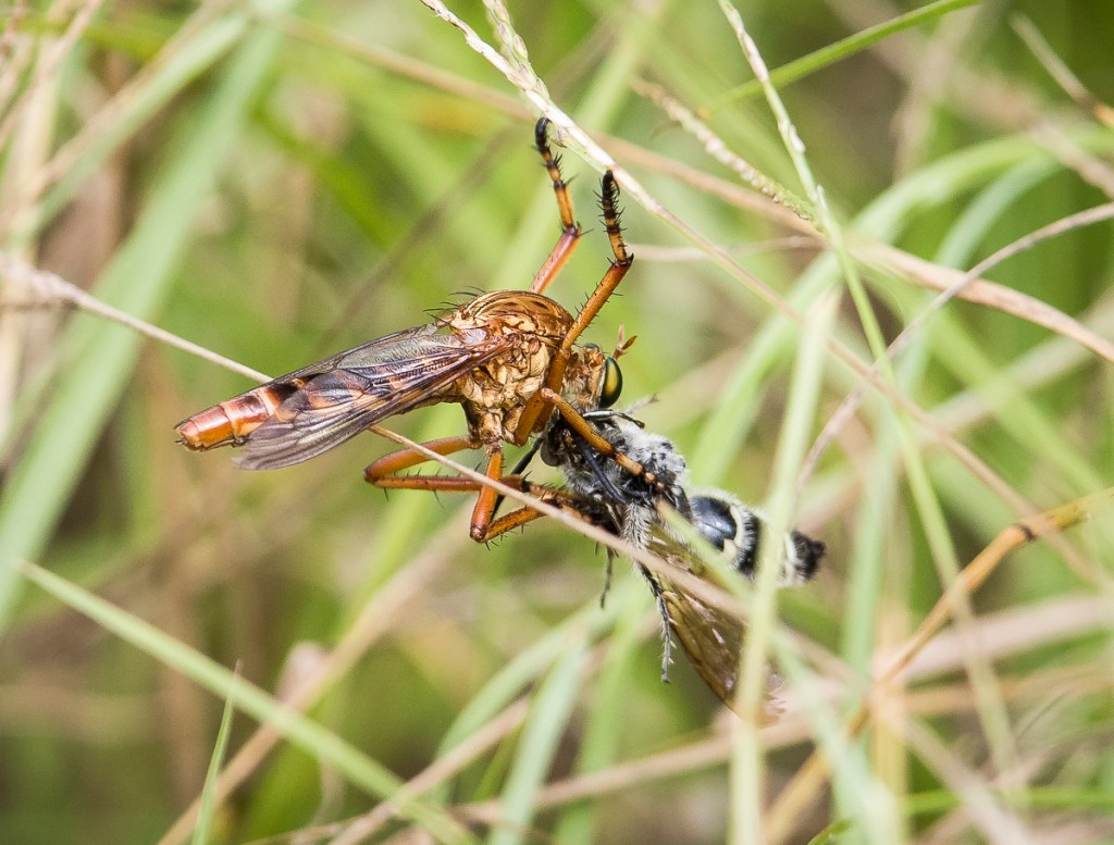I hiked in to a small pond on the back side of a refuge crop field in hopes of seeing a bear cooling off, but there were none. However, I was rewarded with a couple of unusual robber flies flitting about in the tall grass. I could see they had very long, dangling legs. As I walked, they would fly off a few feet and land again in the grasses, hanging by one or two of their legs in the tangle of linear blades. One in particular caught my eye as it was carrying a prey item (I think some type of Digger Wasp). I had my telephoto lens so it was a challenge to get down and find a spot that wasn’t entirely blocked by crisscrossed grass blades.