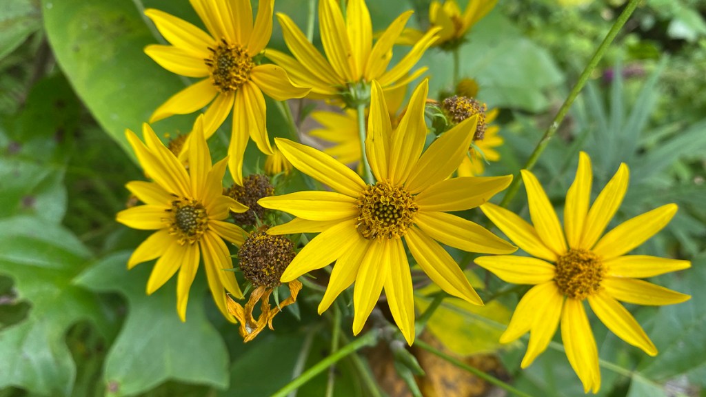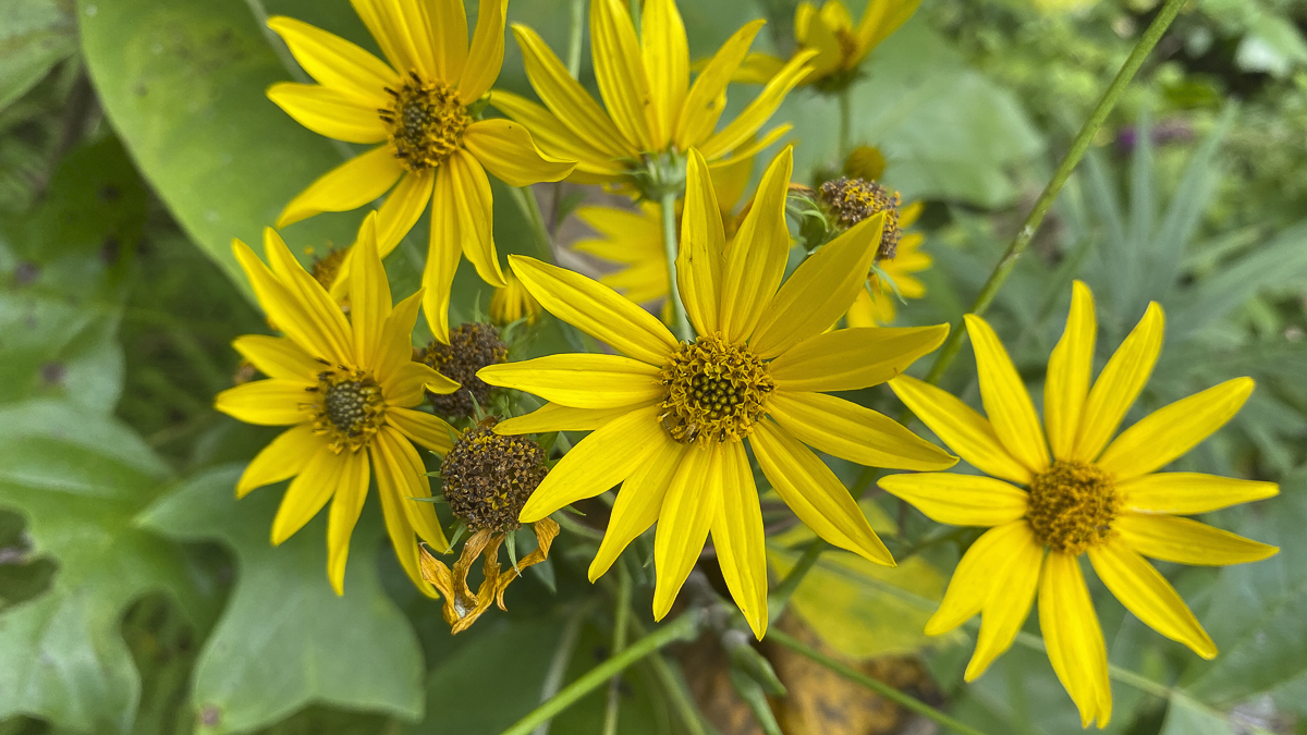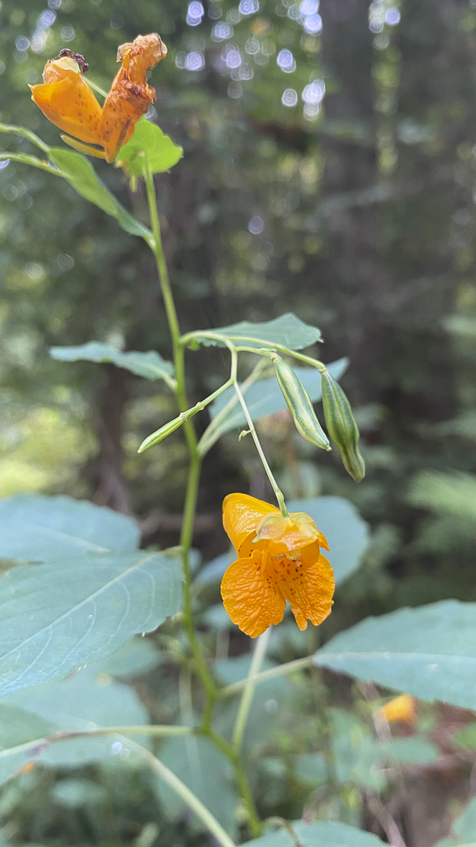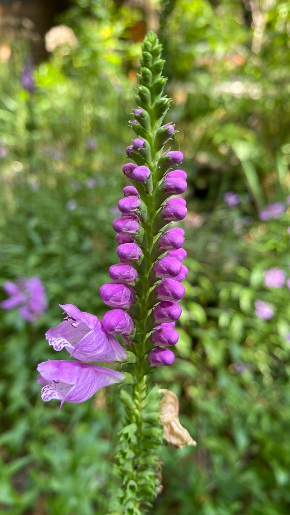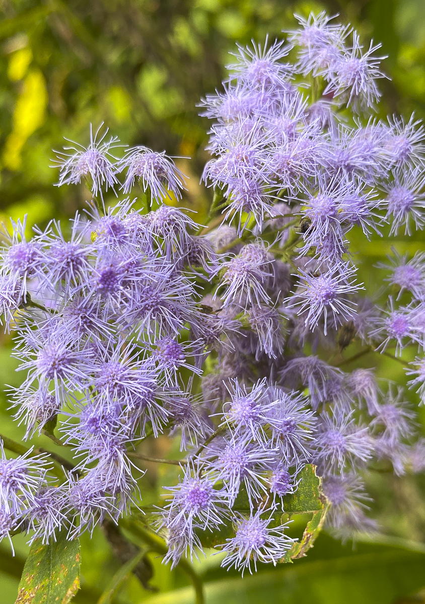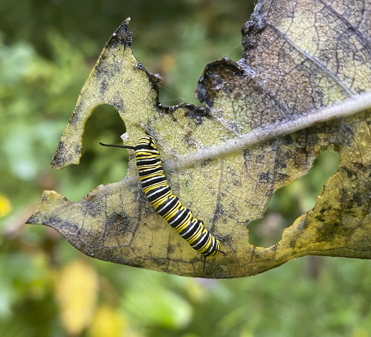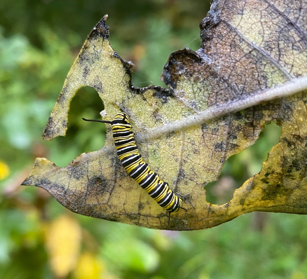Swamp Sunflower exhibits one of the dominant flower colors of autumn – bright yellow (click photos to enlarge; all photos taken with iPhone)Obedient Plant shows the other fall color so common in our late wildflowers – purple. The combination of purple and yellow must be attractive to the late season bees.MistflowerThe rich brown of Painted Buckeye seeds on the forest floorJewelweed has had a very good fall in our garden and the hummingbirds loved it. The swollen seed pods shoot the seeds when touched giving the plant another common name, Touch-me-not.A very late season Monarch caterpillar on Common MilkweedThe beautiful orange, white, and black of a freshly emerged Monarch ButterflyOrange and black again, from?…these have been very active the past week or so.Mushrooms, like this Russula sp., have been popping up all over our woods and yard the past few daysMy favorite mushroom find was a few of these Carolina blue, Lactarius sp. milk cap mushrooms down in our woods