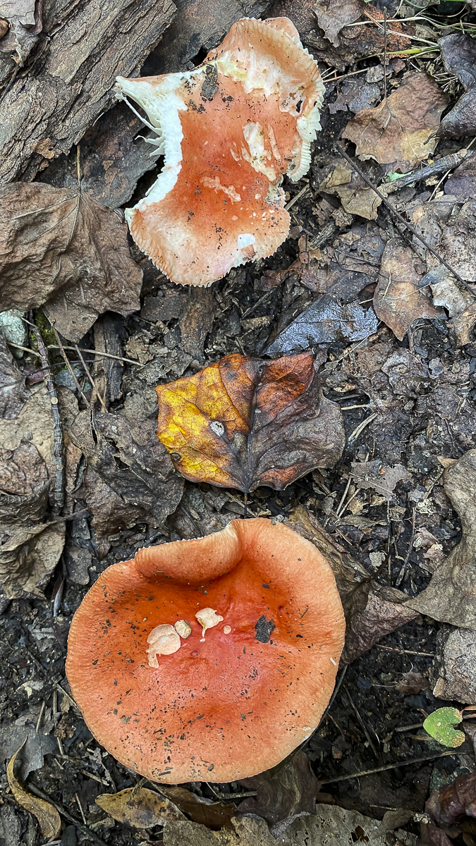 When we think of autumn, we often think of fall colors, specifically the onset of the kaleidoscope of colors created by the changing hues of tree leaves. But there are many other fall colors to enjoy that require looking down, not up. Here is a sampling from the past week or two here in the woods.