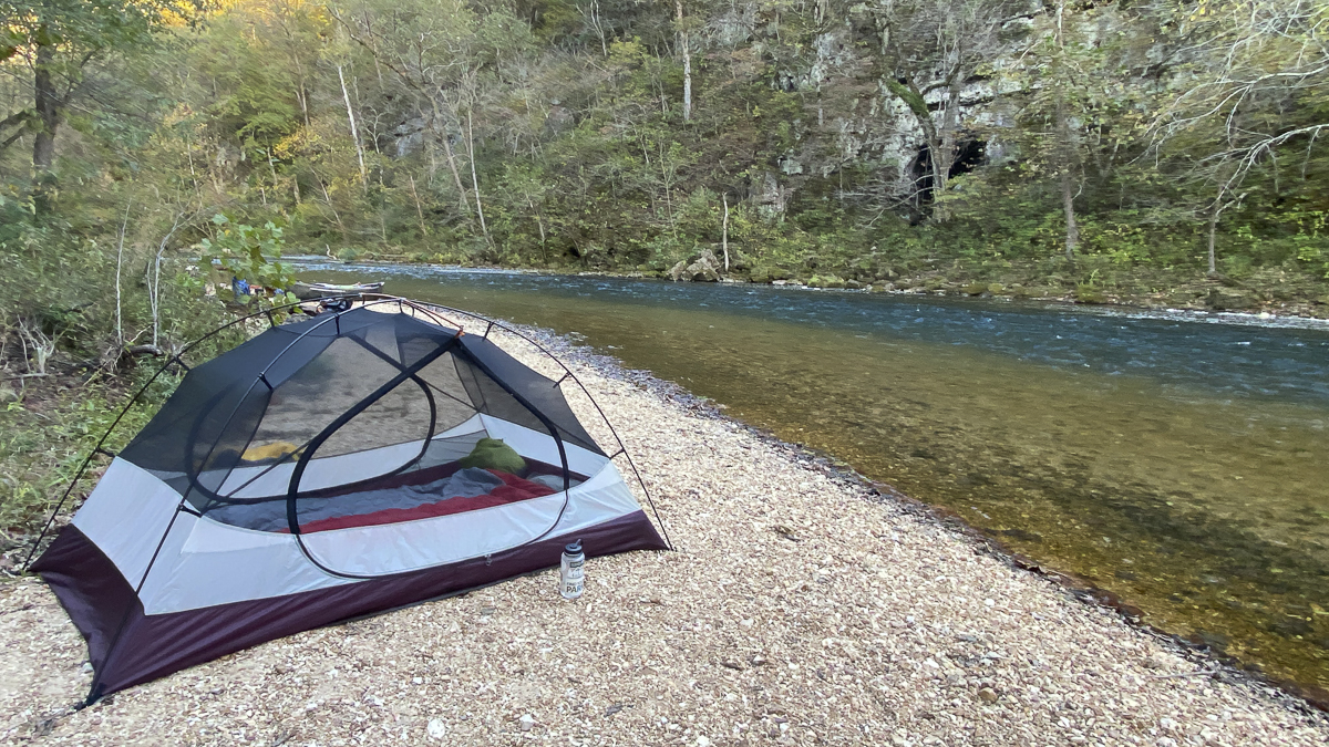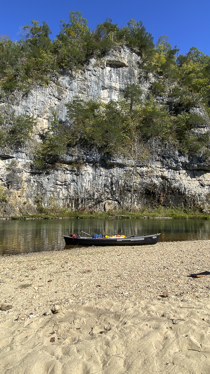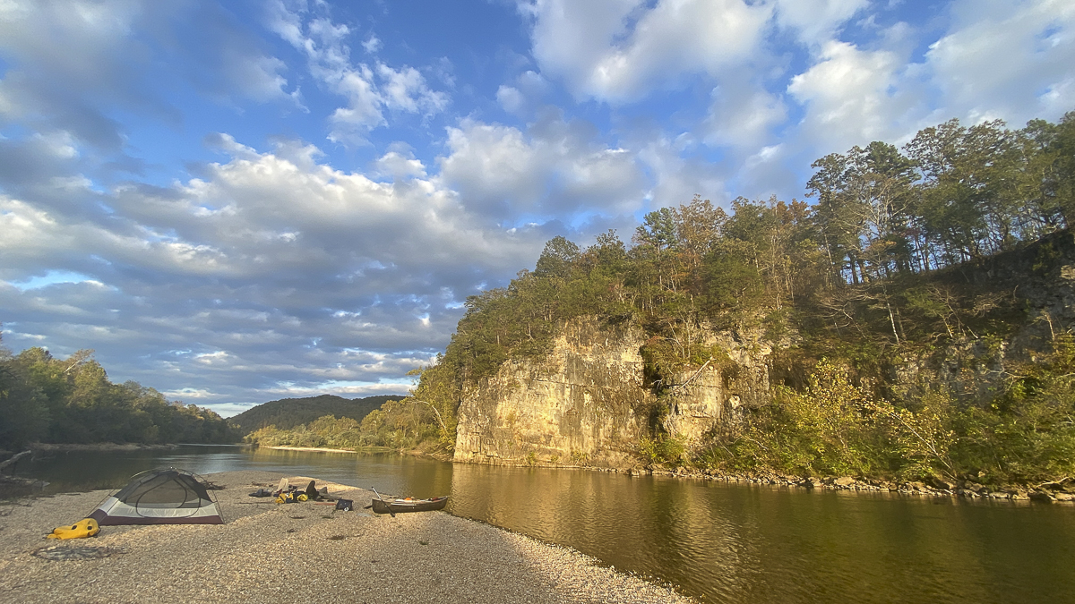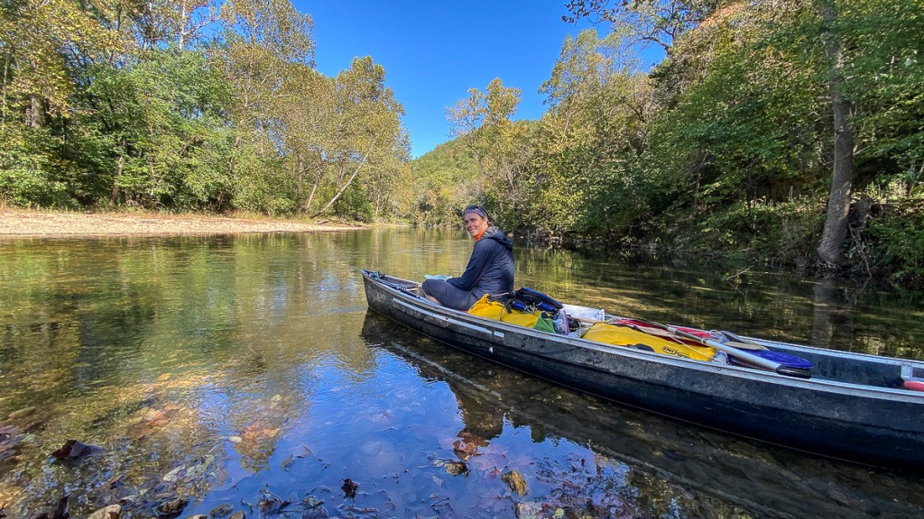 it has been a little over a month since our paddling adventure. I’m finally getting around to sharing some of the incredible memories from that trip. My knee has been causing some real problems these past few months so we agreed to try a paddling trip rather than a backpacking one (whew!). Based on a friend’s recommendation and our experience in Arkansas on our last trip, we looked at rivers in that state and adjoining Missouri and finally settled on two trips – the Current River in MO and the lower Buffalo River in AR. This time of year you have to choose your rivers carefully so as not to be dragging your canoe everywhere due to low water levels that are typical in Fall. The Current River fits the bill nicely as it is largely spring fed and so has relatively constant water flow. Melissa did the research and planned a 6-day trip totaling about 61 miles. We arranged a shuttle with one of the several park-approved vendors (both rivers are under National Park Service jurisdiction). We had delayed in the mountains of NC at the start of our trip enough that a storm front had passed by the time we arrived at our campsite on the Jacks Fork River (which feeds into the Current) the night before our launch. If that river was any indication of things to come, this was going to be an awesome trip…