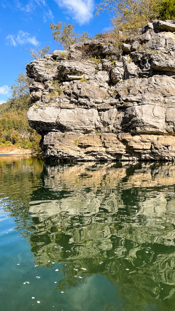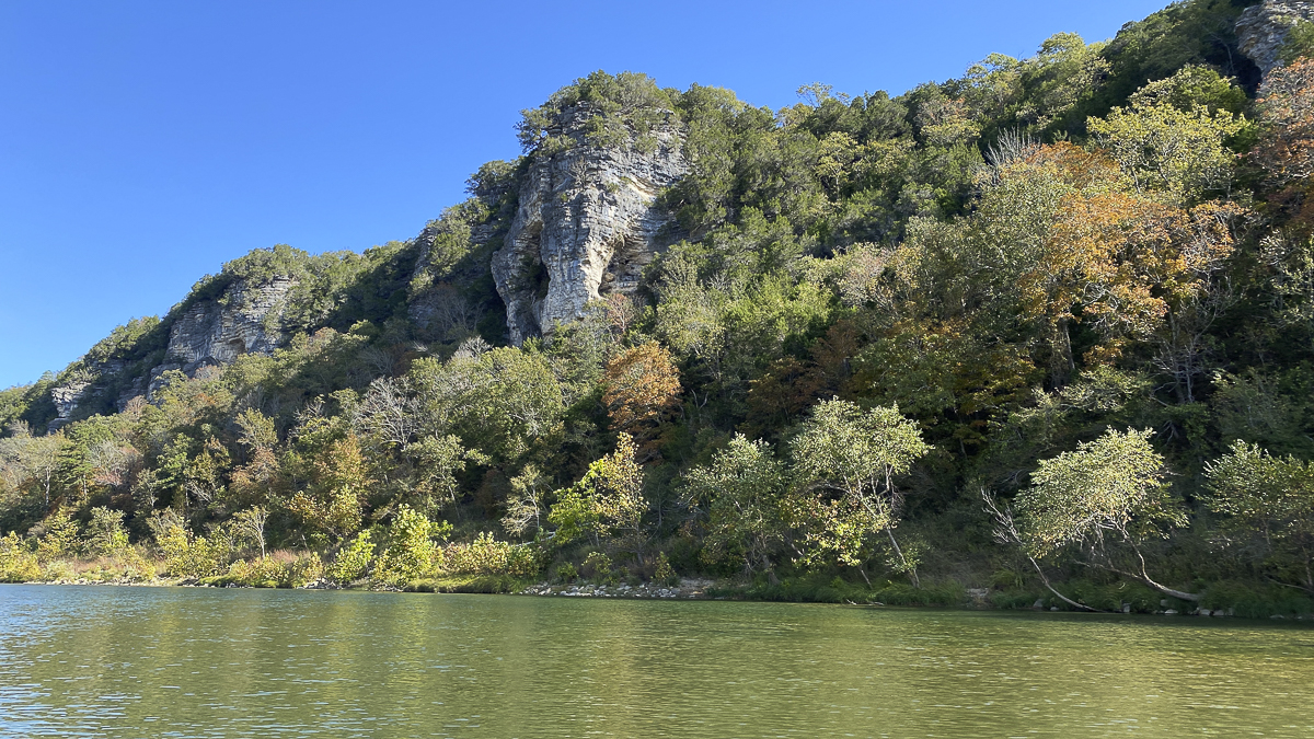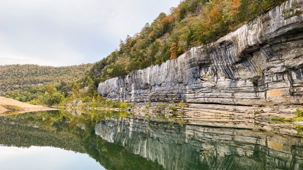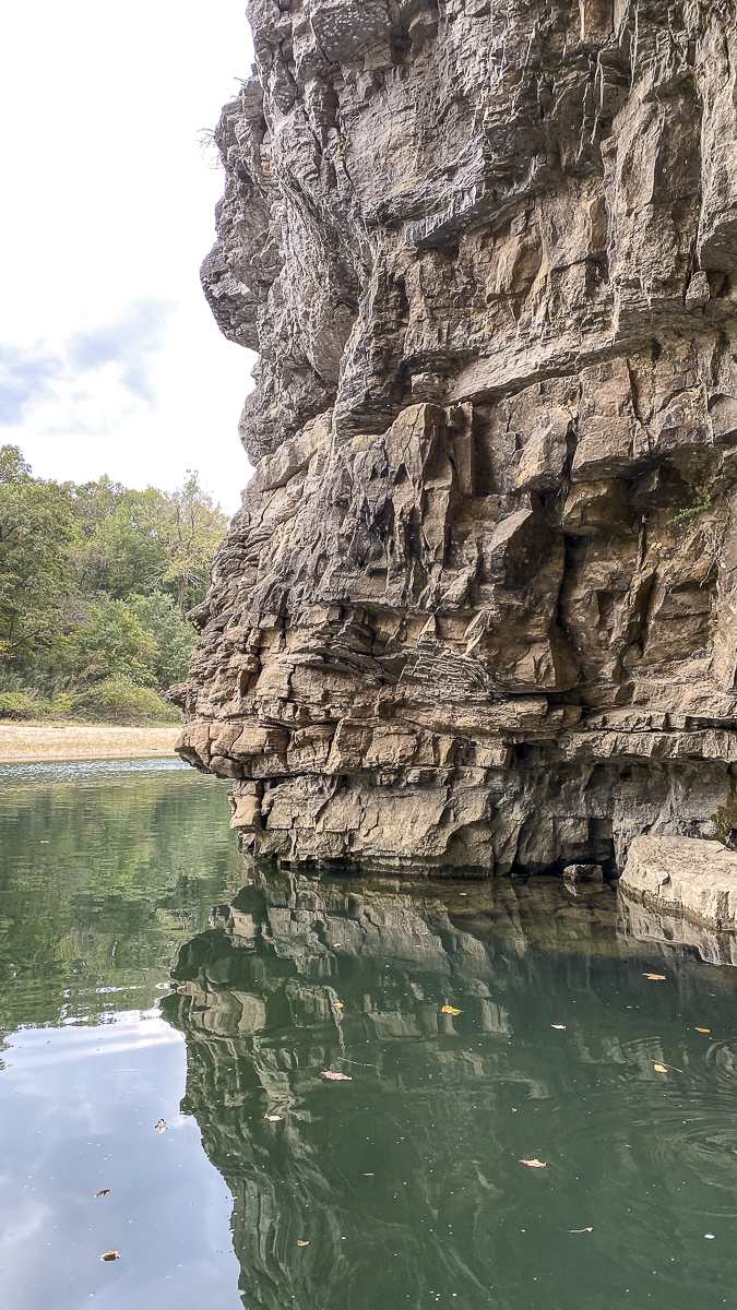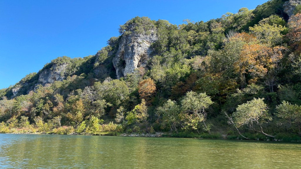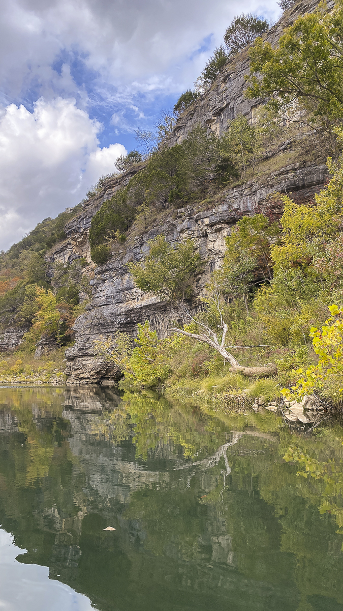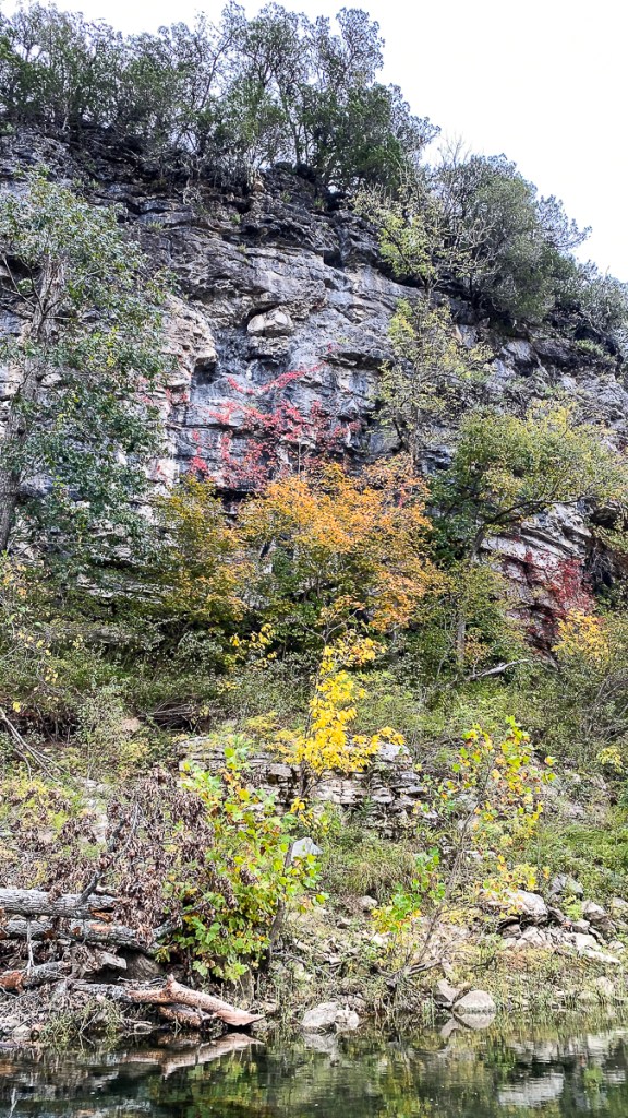 Right away, the Buffalo impresses you as being on a grander scale than the Current River – the bluffs are longer and much higher, soaring to about 500 feet above the crystal clear river in some areas. The cliffs are sandstone, limestone, and dolomite and add a dramatic backdrop to the beauty of the river. Fall color was just starting to paint the bluffs with red and yellow and many of the deeper hole in the river were that same aquamarine we had seen on our previous paddle.