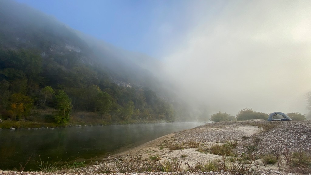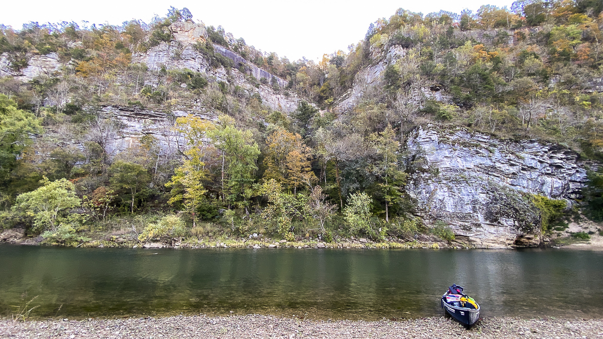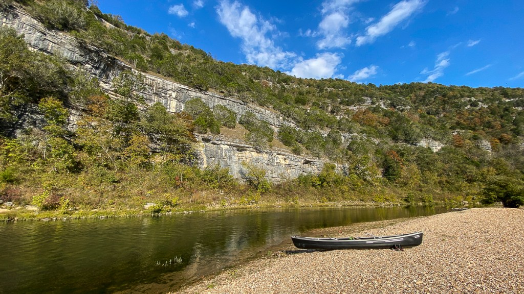 Our second paddle adventure back in October was on a section of the Buffalo National River in Arkansas. The Buffalo River was our nation’s first national river, designated as such in 1972. It flows over 135 miles and is one of the few remaining undammed rivers in the lower 48 states. Unlike the spring-fed Current River in Missouri, the Buffalo is largely rainfall dependent. This means paddlers must be very aware of possible changes in river levels due to storms, even those far upriver. When we stopped at Wild Bill’s Outfitters to arrange our shuttle, the staff mentioned the possibility of severe storms during our stay, with a chance for hail, possible tornadoes, etc. He added that these predicted storms often “amount to diddly-squat” as they tend to break up when they hit the mountains. But, he echoed the park literature advice and said we should “camp high” on the gravel bars since the river can jump over one foot in an hour under the right conditions. Melissa asked, how high is high? He said at least 4 feet, and make sure you have an escape route to higher ground, just in case. Well, four feet above the river level is not a common change in elevation on many of the gravel bars we encountered and on some that did have that, they dropped down as you approached the higher ground, so you could end up being on an island if the river rises, which is something that is not advised.
