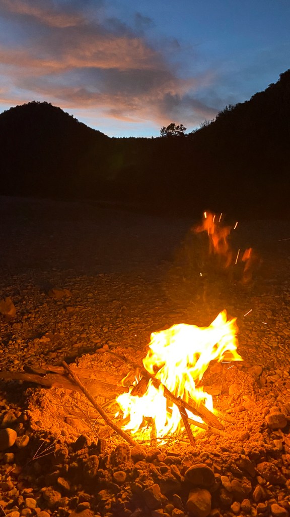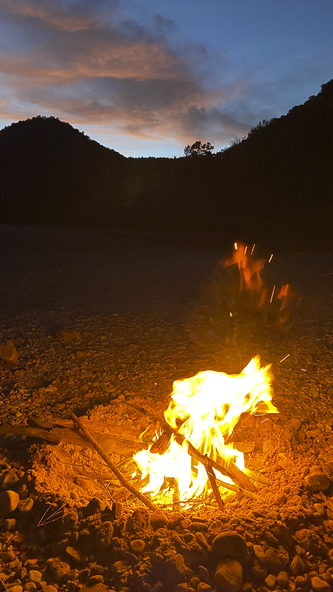 After a gorgeous sunset we settled in for a nice campfire and some star gazing. It wasn’t long before we experienced something new to us both – exploding rocks in the campfire. There was a particularly large burst of flame and sparks when I added some sticks to the fire early in the evening which caught us both by surprise. We thought it was something in the sticks I had added until we started hearing little whizzing sounds, similar to the sounds a flying bullet makes in cartoons. Suddenly, Melissa got hit in the forehead by a small pebble and we realized the rocks were exploding in the fire. This, our last night, was the first time on our entire trip we had experienced anything like this. It turns out, exploding campfire rocks is a thing caused by moisture trapped in certain rock types. When the rock gets heated high enough, the water vaporizes and can cause the rock to splinter, shooting rock fragments up to several feet. We scooted back away from the fire, and I stirred it, spreading out the ashes to reduce the heat. This soon stopped the rock fireworks. Melissa surmised that the cliff face near us was sandstone rather than the dominant limestone and dolomite bluffs we had encountered on most of our trip and this created this unusual phenomenon.
