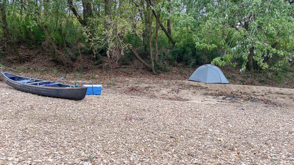 On our second night, we searched for a campsite that was a few feet above the river level as this was the night for the predicted storms. We found a location about 4 feet in elevation, but it required dragging the canoe quite a distance (unloaded, of course). But we felt secure and had our backs to some higher ground, just in case. No storm materialized in our area that night, but at one point I looked out and could see near constant lightning far off to the west.