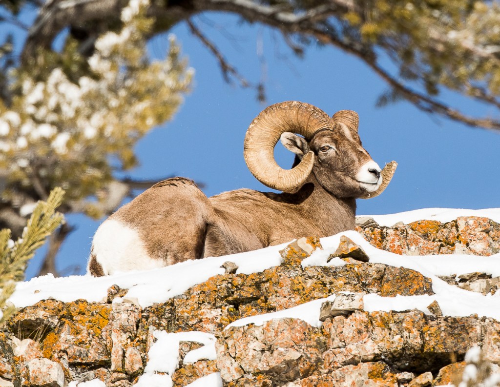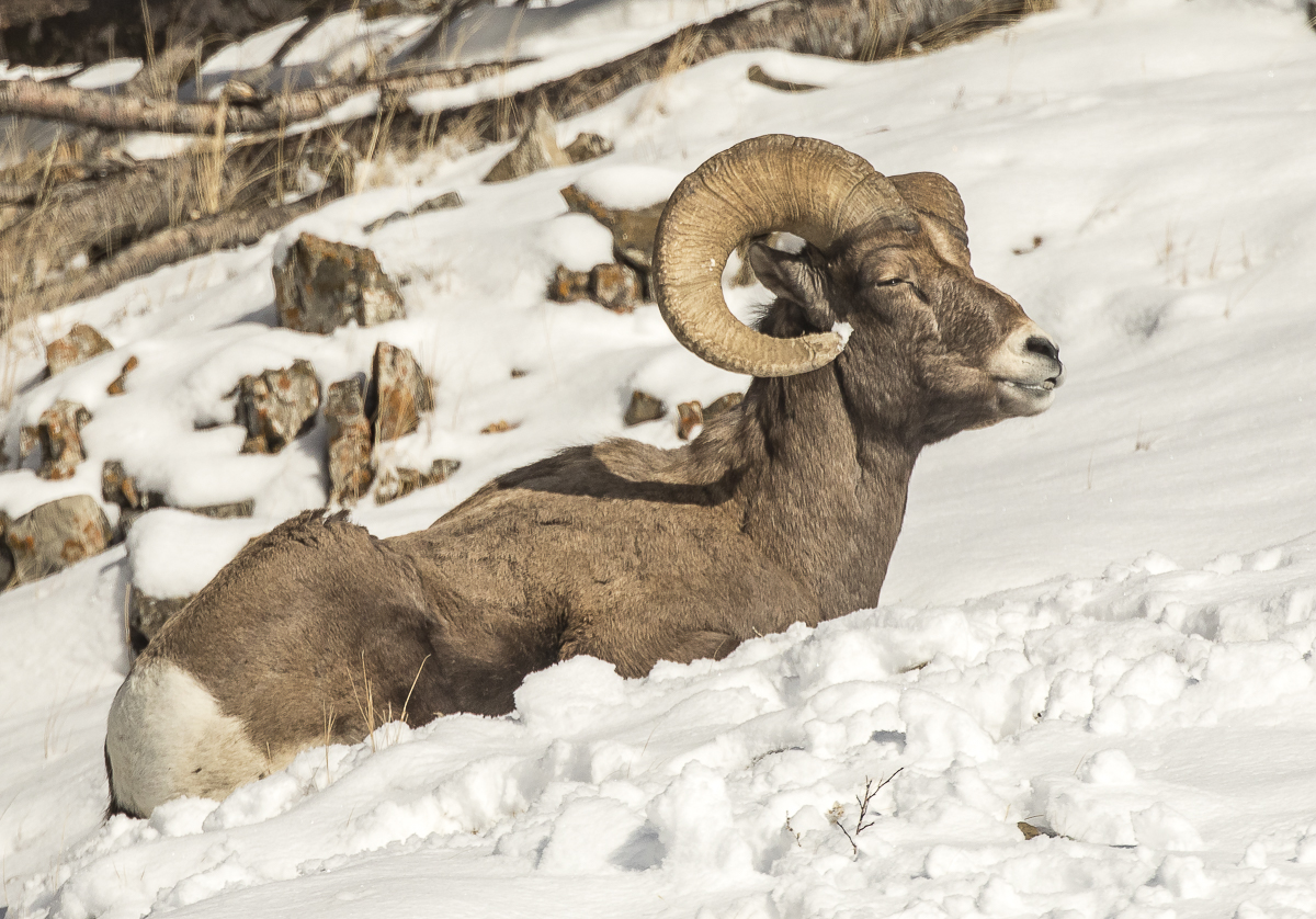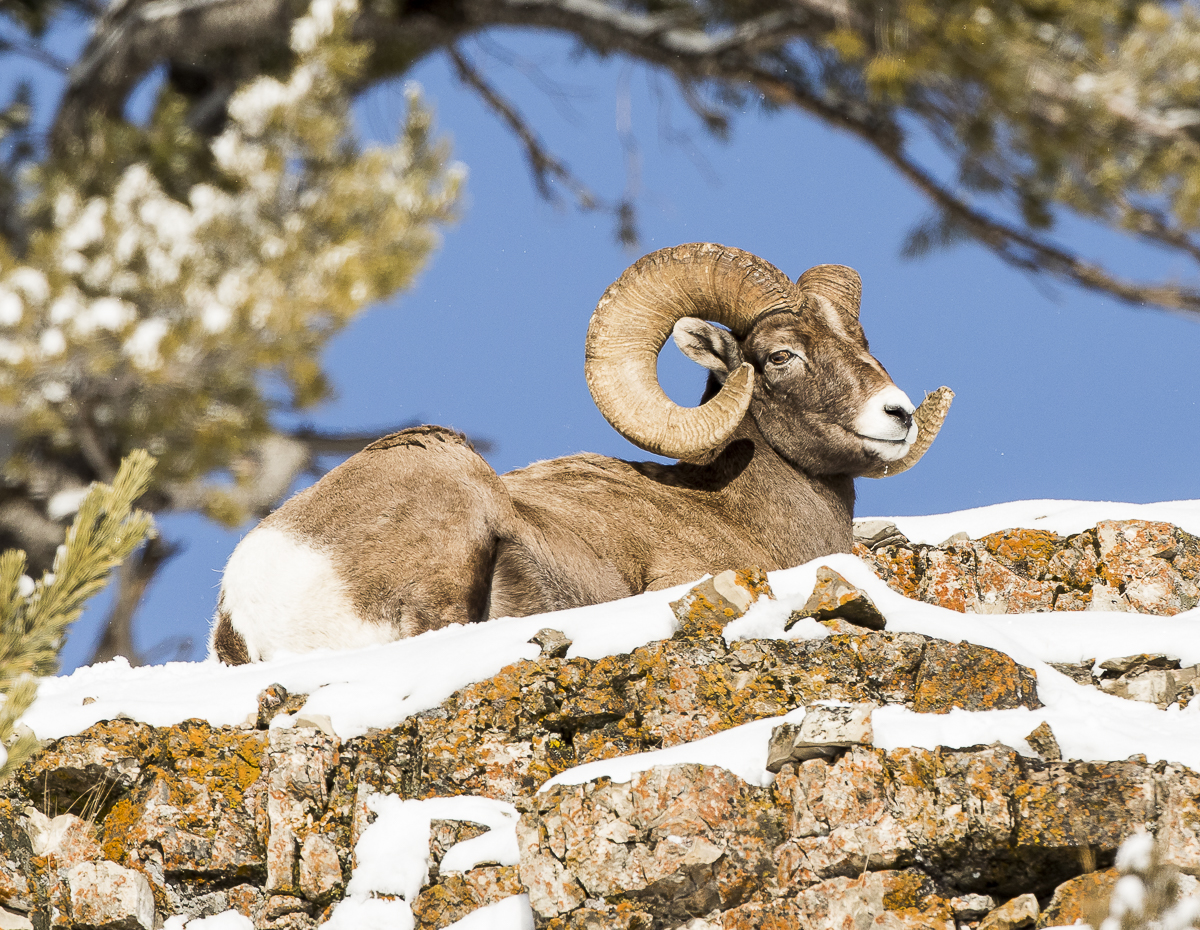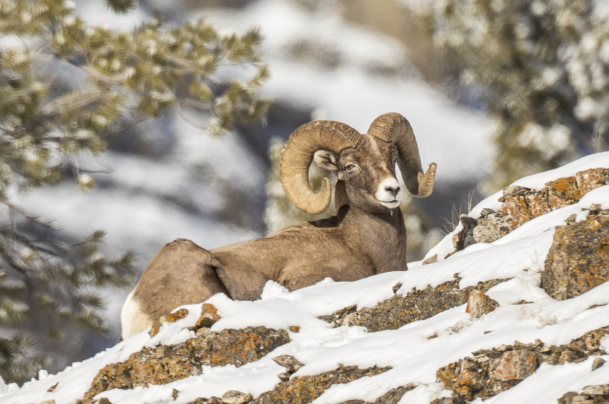 Among the most photographed animals I saw on this trip were a group of bighorn rams hanging out at the usual small cliff near the confluence of Soda Butte Creek and the Lamar River. This is consistently a good spot for sheep in the winter as I guess the small steep rock face provide just enough protection as an escape from potential predators like wolves. The cliff is a short walk from a pullout and you can get decent images from the roadside, which doesn’t seem to bother the rams at all. Here are a couple of examples…