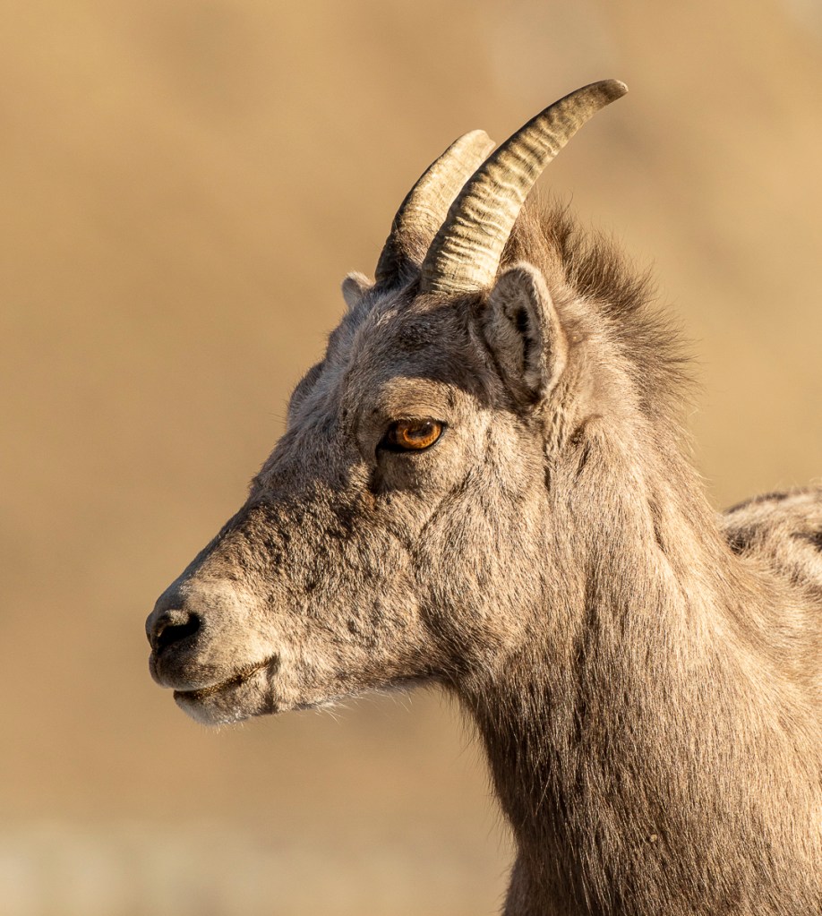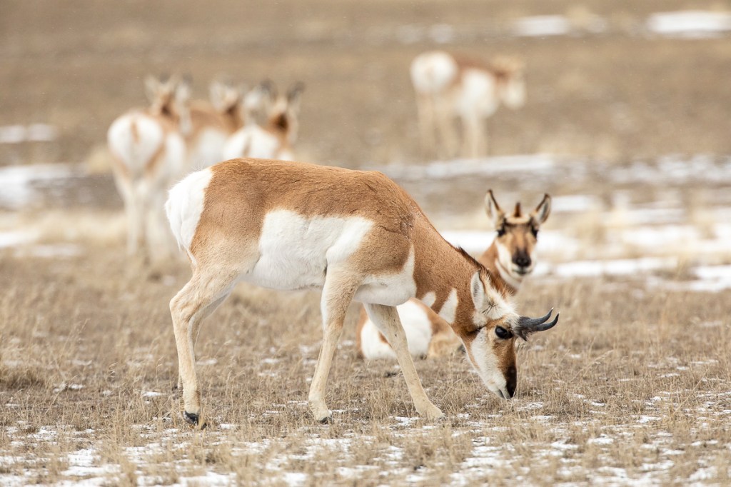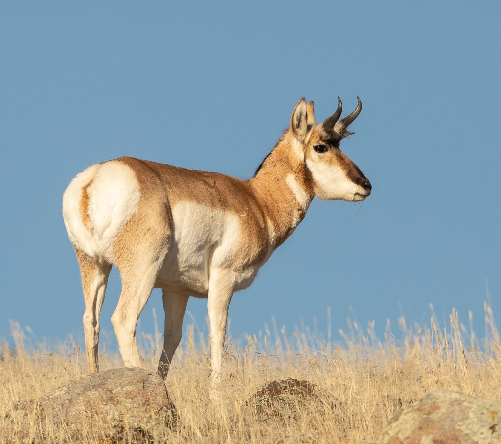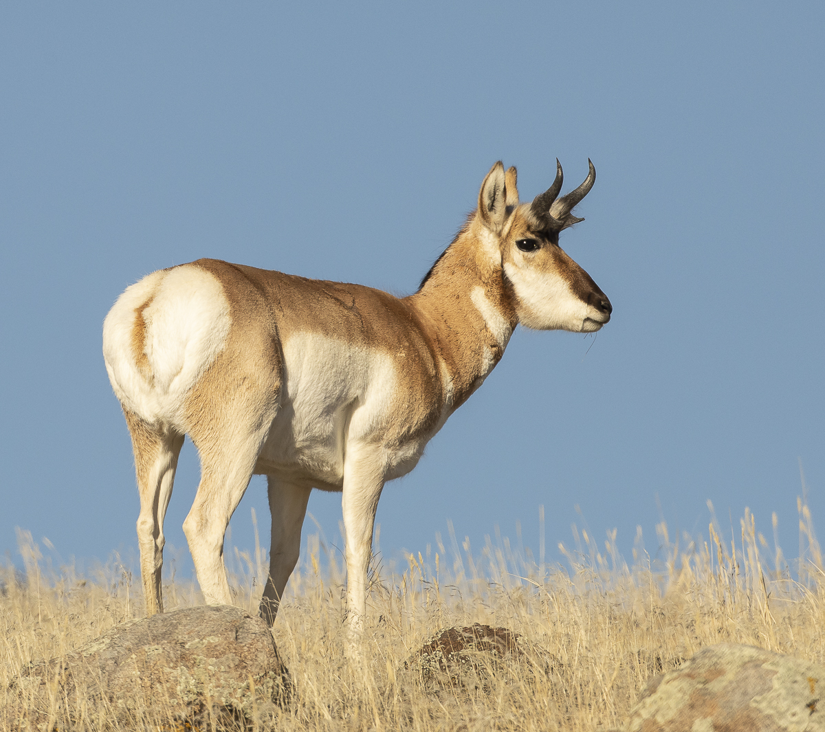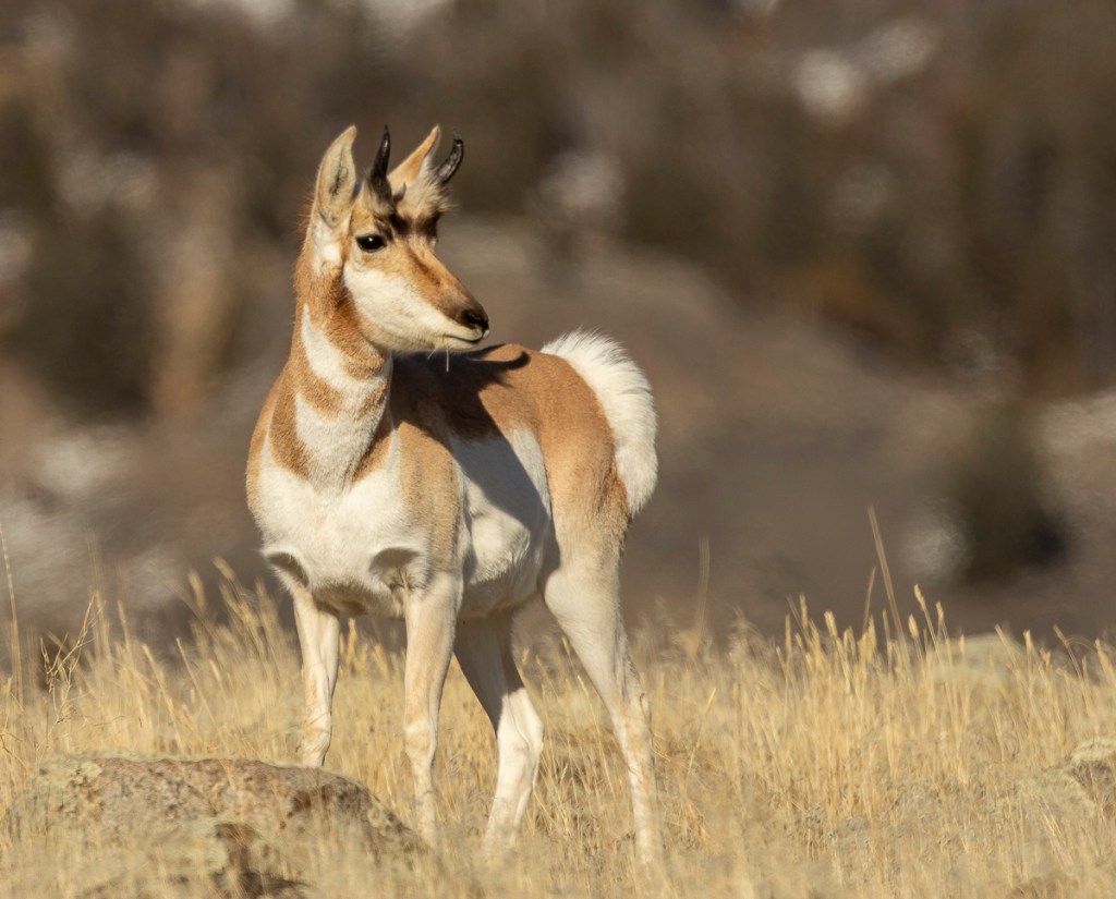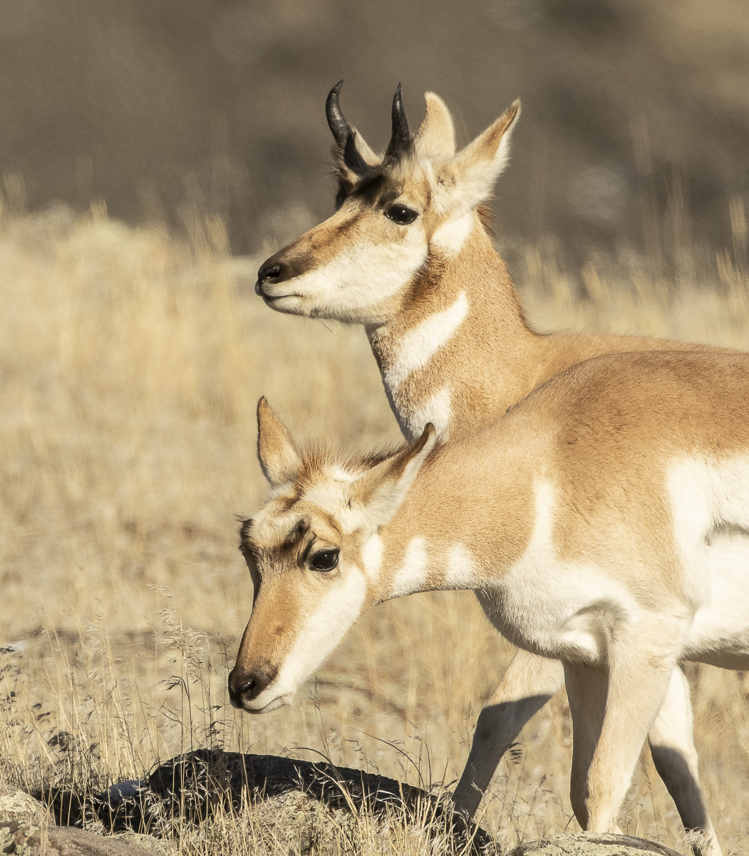One ungulate, in particular, tends to leave all but the lowest elevations of the park (near the North entrance) every winter – the Pronghorn. Though they are common in Lamar Valley in summer, they all migrate over 25 miles to spend the winter near Gardiner or even farther north. Deep snow makes it difficult for them to browse and greatly diminishes their primary defense against predators – their speed. They are the fastest land mammal in North America, reaching burst speeds of a little over 60 mph and capable of sustained speeds of 45-50 mph. This makes them the second fastest mammal on Earth, second only to the Cheetah (but Pronghorns can keep up a fast speed longer than a Cheetah). Their large eyes are located on the sides of their head to allow for all-around viewing. And they have a large (for their size) heart, windpipe, and lungs, allowing them to get plenty of oxygen and blood supply for their high-octane movements.