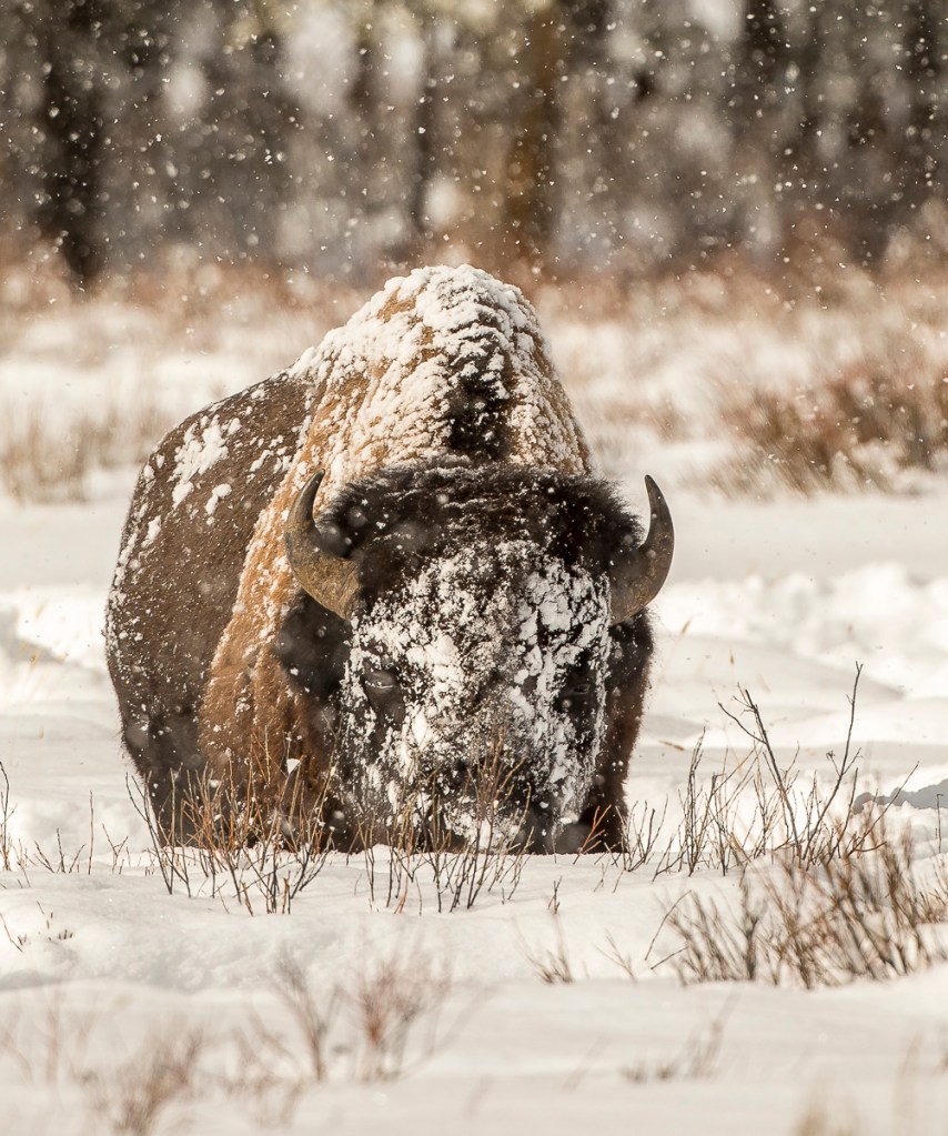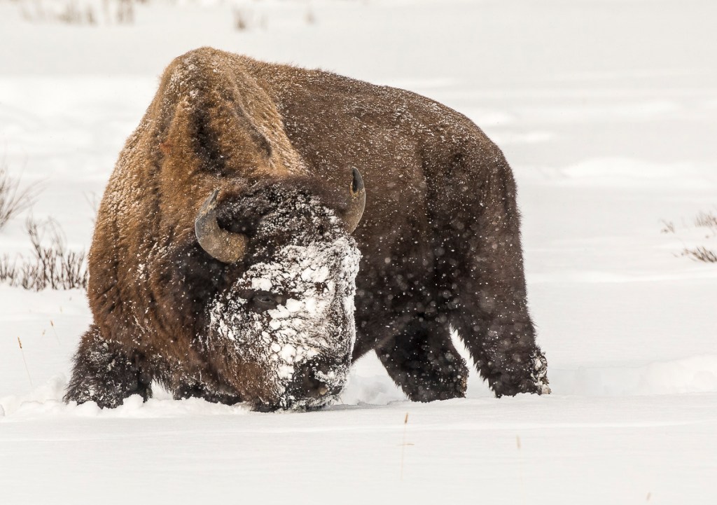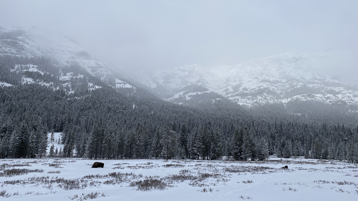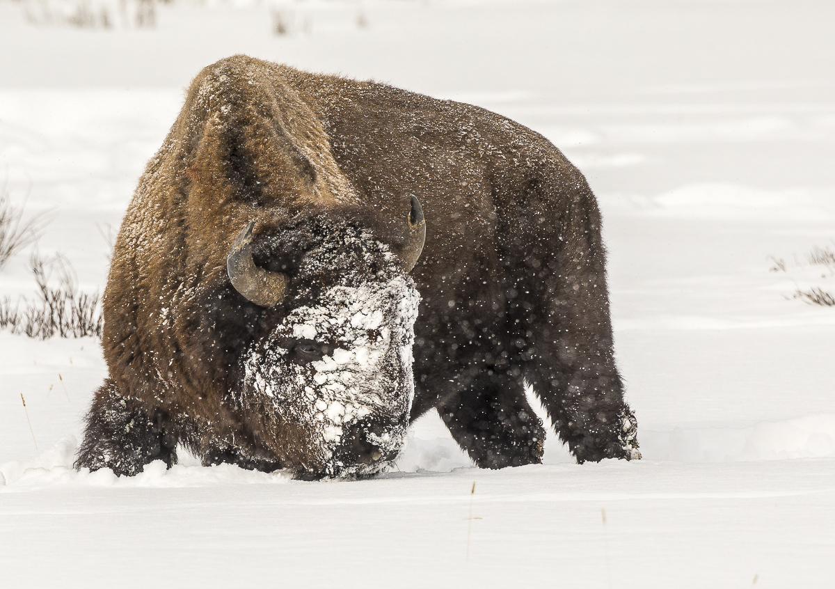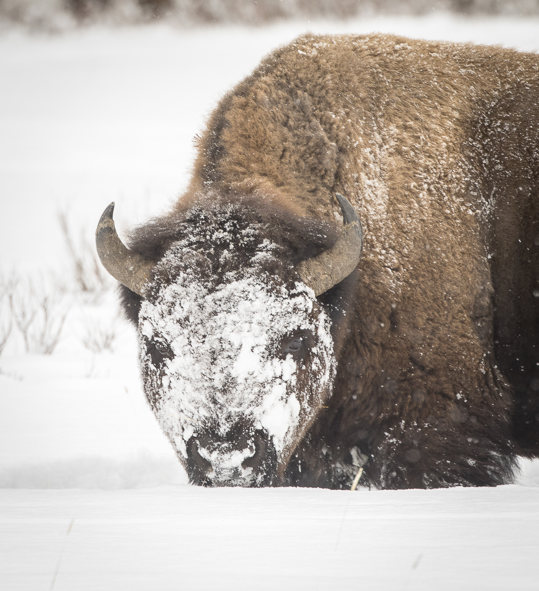 I have always had an affinity for Yellowstone Bison (I blame the movie Dances with Wolves), so I try to spend some time alone on each trip with these iconic creatures. I managed to spend over an hour one day with two large bulls, watching them feed in a picturesque valley below the towering Baronette Peak. Snow was falling, and then patches of blue sky would appear, and then more snow. None of it fazed the Bison as they plowed through the snow with their massive heads.