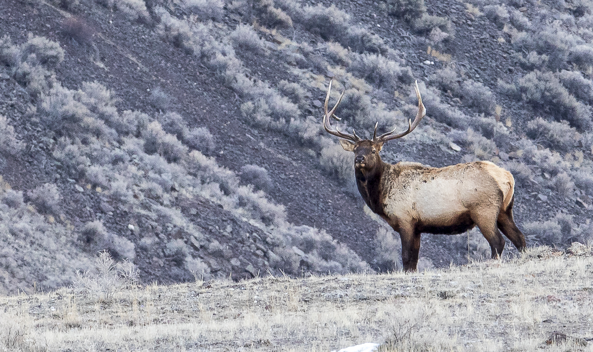 Many of these grazers move to lower elevations in winter due to the usual heavy snow in much of the park.They tend to congregate in the Northern Range due its lower snow pack and in areas near or beyond the North entrance at the town of Gardiner, MT. Indeed, one of the hazards of staying where we did, several miles north of Gardiner, was that we had to run the gauntlet of roadside Elk every morning and evening in darkness (definitely not a critter you want to encounter with your vehicle). These large members of the deer family undoubtedly gain another advantage by relocating to these areas in winter as there are probably fewer wolves due to the human presence (although that means they do encounter hunters).
