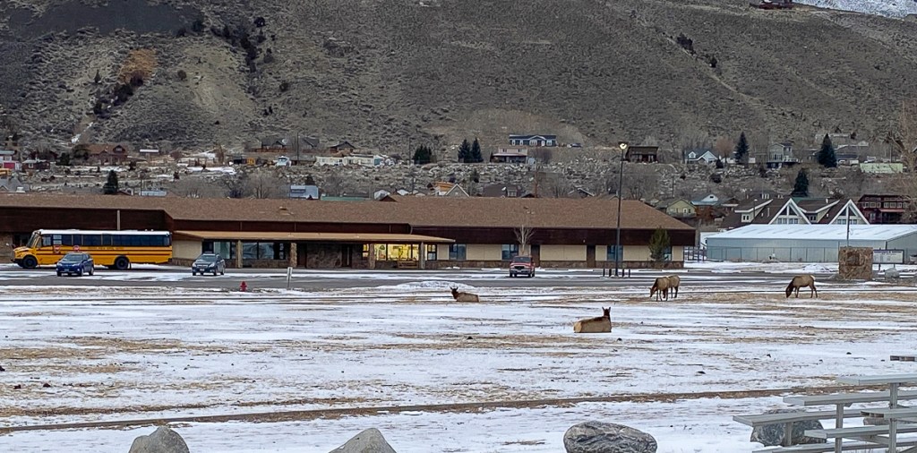 The town of Gardiner lies in a rain shadow area and is below 6000 ft in elevation, so it tends to have milder winters than most of the park. It is amazing to me how the wildlife adapts to the town (and vice versa). One example is the use of the school’s athletic field as a hangout and grazing spot for Elk, Bison, Pronghorn, and a variety of other critters. I like to think that one unique form of detention at this school involves going out to the field and removing the scat piles before a game.