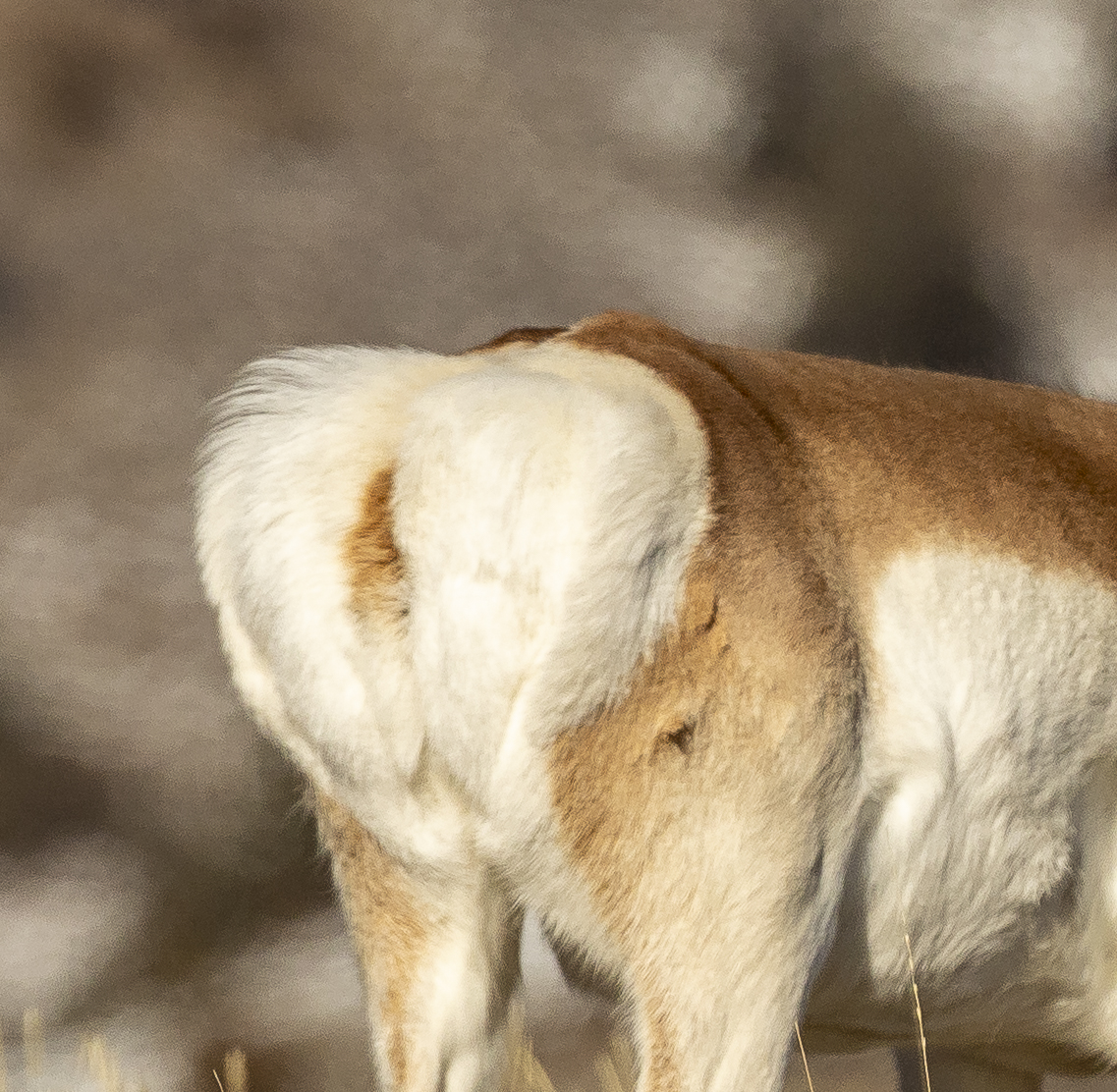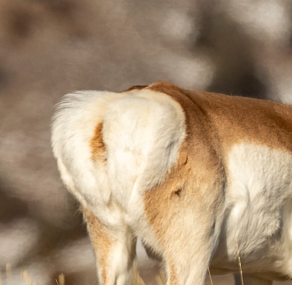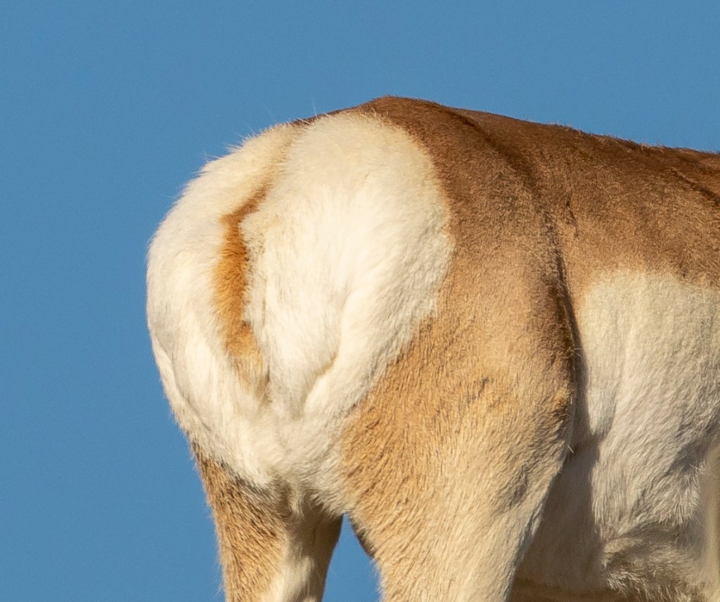Since vision is such an important trait for Pronghorns, and since they live in herds in open habitats, they have another communication signal used to alert other herd members of danger. If a Pronghorn sees a predator, it raises the white hairs on its rump, making a large white patch visible for considerable distances. They also release an alarm odor from glands on the rump (it supposedly smells like buttered popcorn – probably why you never see Pronghorns at the movies…they would be freaked out all the time).