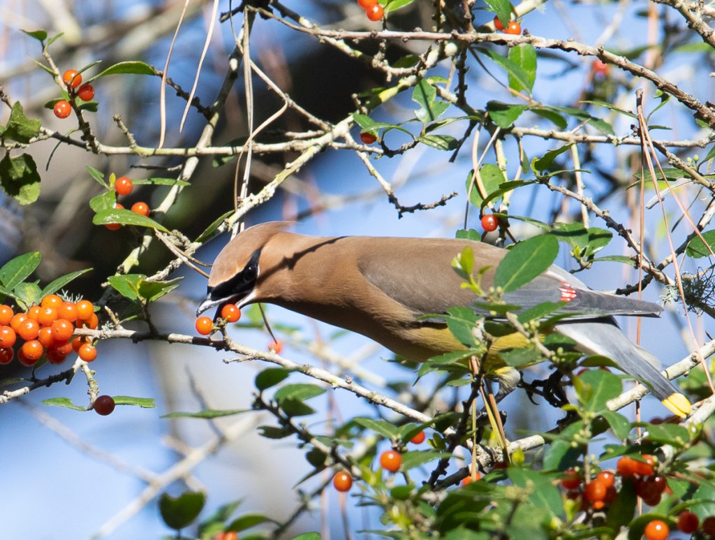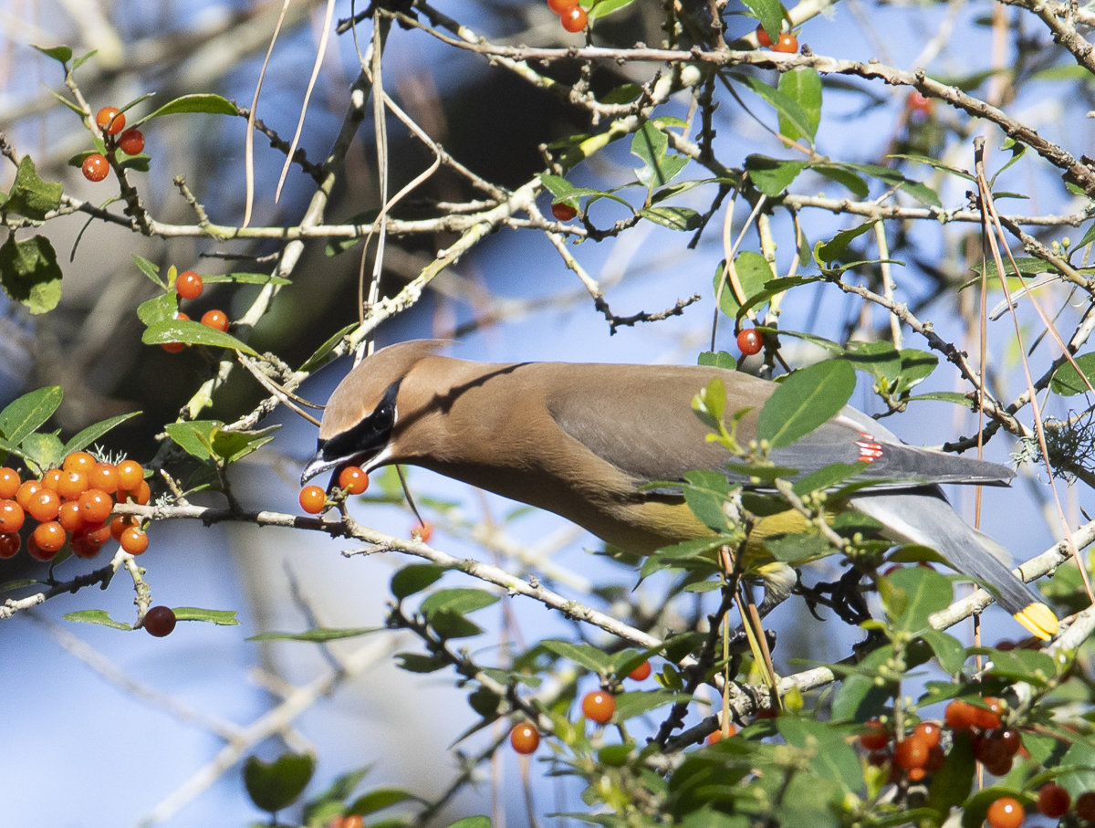My trip last weekend included some time at both Myrtle Beach State Park and nearby Huntington Beach State Park. While hanging with friends at the former park, I was impressed by the amount of bird activity and marine life (from the ocean pier) we saw. Cedar Waxwings were everywhere scarfing up the ripe Yaupon berries. The surprise birthday party for my friend was held at one of the picnic shelters and there happened to be some Yaupon trees along the road edge so I finally took my camera over toward the trees and stood for awhile hoping the flock would come in closer. They were pretty spooked by all the bicycles and cars going by so I managed only a few images.