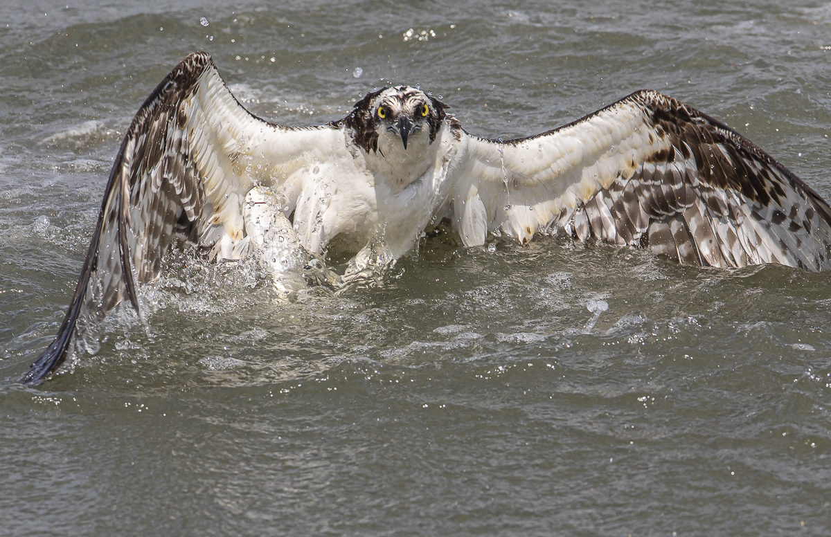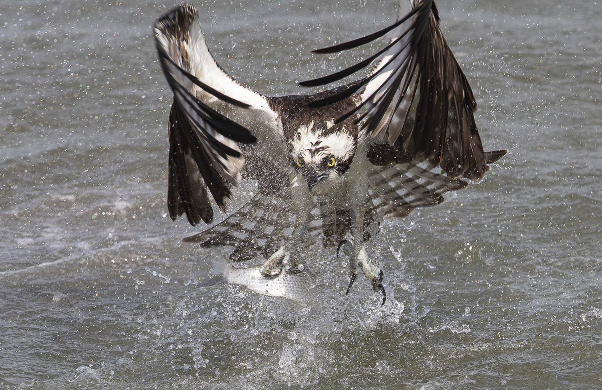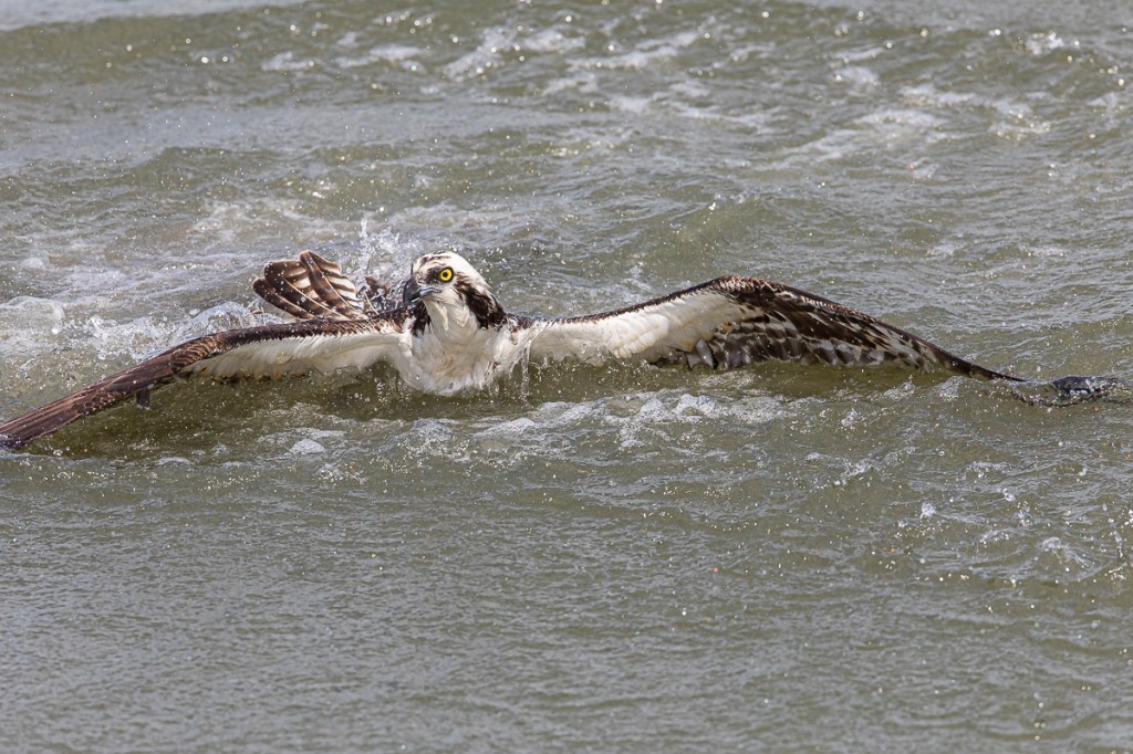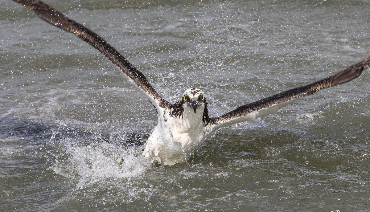 It hit the water several feet out in front of me and was so close that I couldn’t get the whole bird in the photos! Their long wings give the extra lift to pull their prey out of the water. Their nostrils also shut tight as they hit the water.