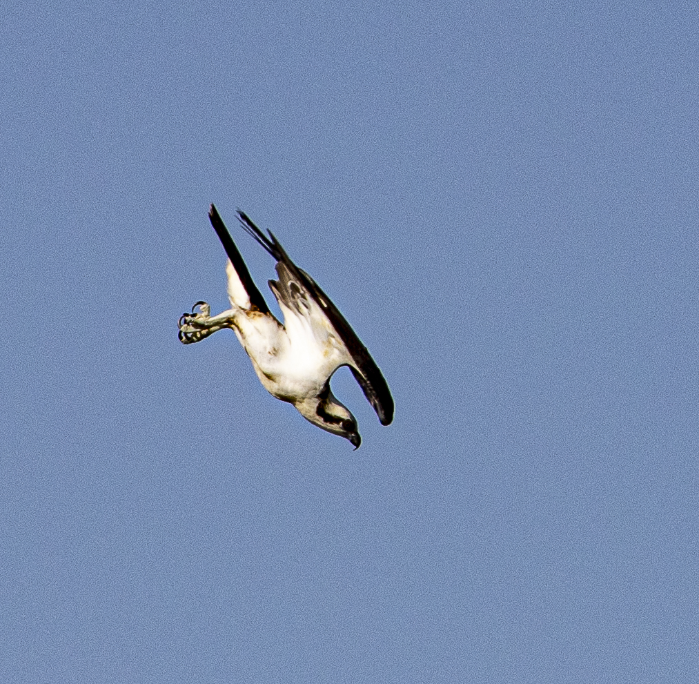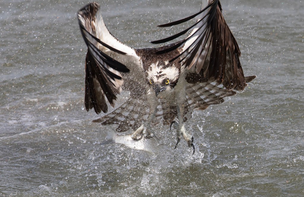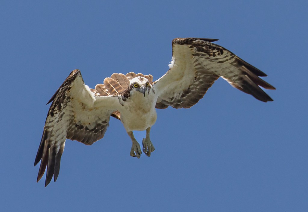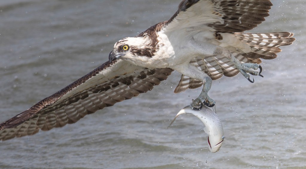 Studies show success rates for Osprey dives of between 24% and 82% (meaning they don’t catch a fish every time). They have specialized toe pads, strongly hooked talons, and a reversible outer toe, all of which give them a better grip on the fish.