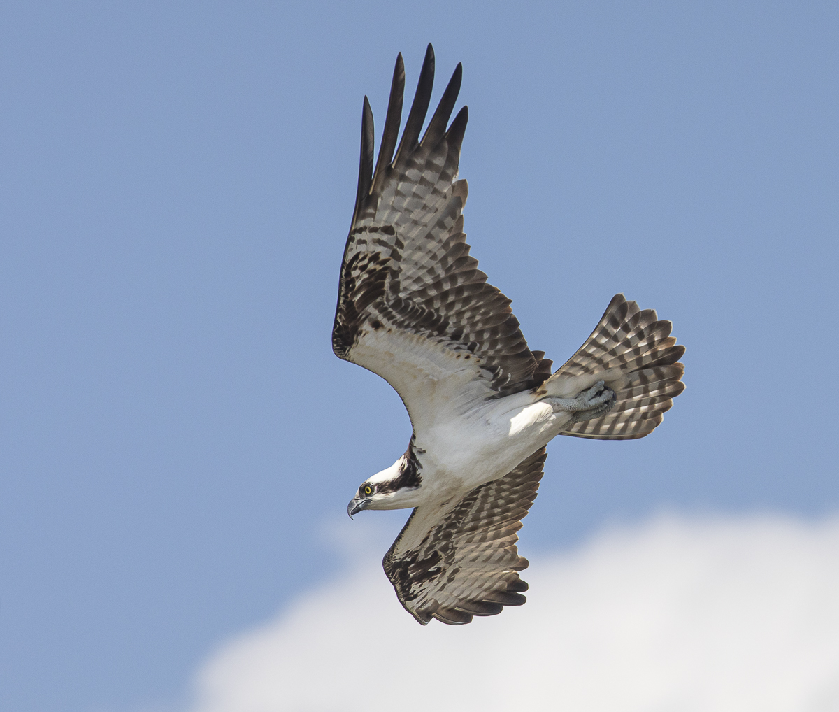My favorite hunters were the pair of Ospreys patrolling both sides of the causeway. I was hoping to get a series of shots of one diving and catching a fish, their primary prey (an Osprey’s diet is 99% fish). An Osprey typically soars over a water body at a height of 30 – 100 feet, scanning the water surface for fish. When it spots one, it will usually momentarily hover, and then fold its wings and drop toward the water. I watched as one bird did this time and again and then pulled up before actually hitting the water.