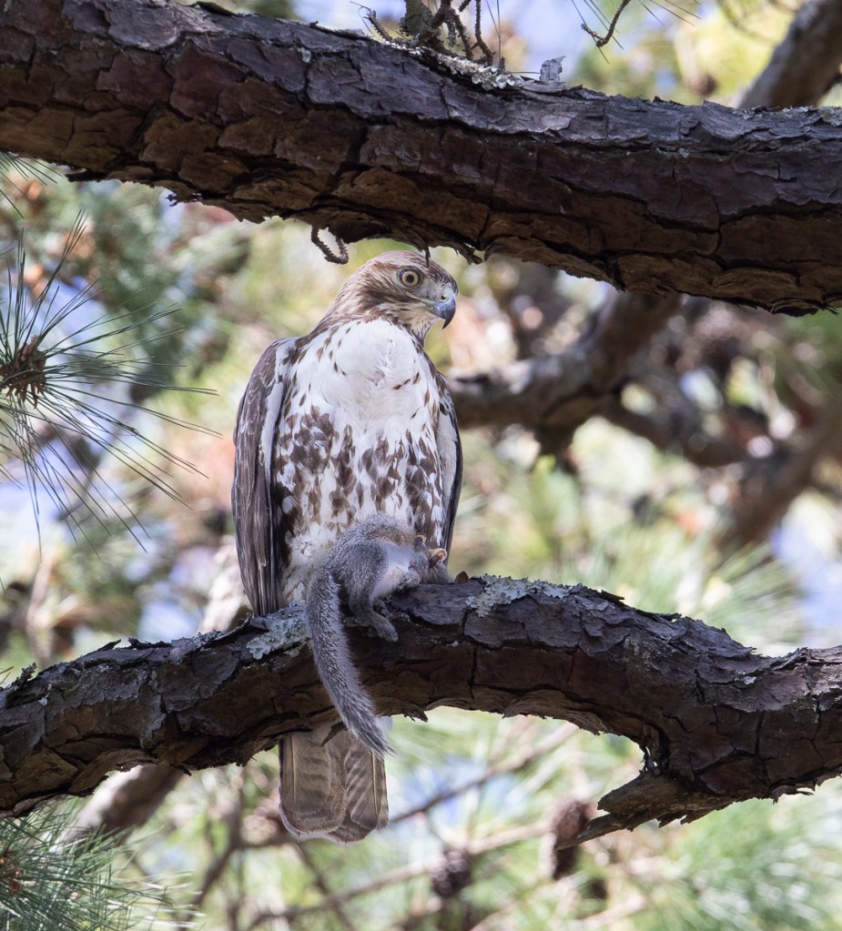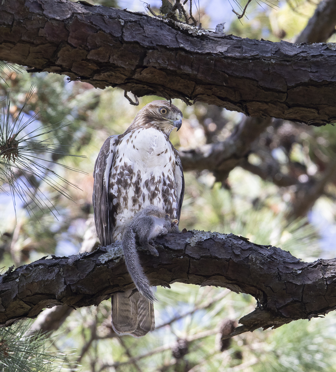 While sitting at the picnic shelter, Scott saw an immature Red-tailed Hawk fly in and land on a pine limb over the road. It had captured what looked like a young squirrel. We all got up and looked at it and it just sat there looking around. I finally eased over underneath to get a photo. It finally took off and flew into the woods a few hundred feet away and began to eat its meal.