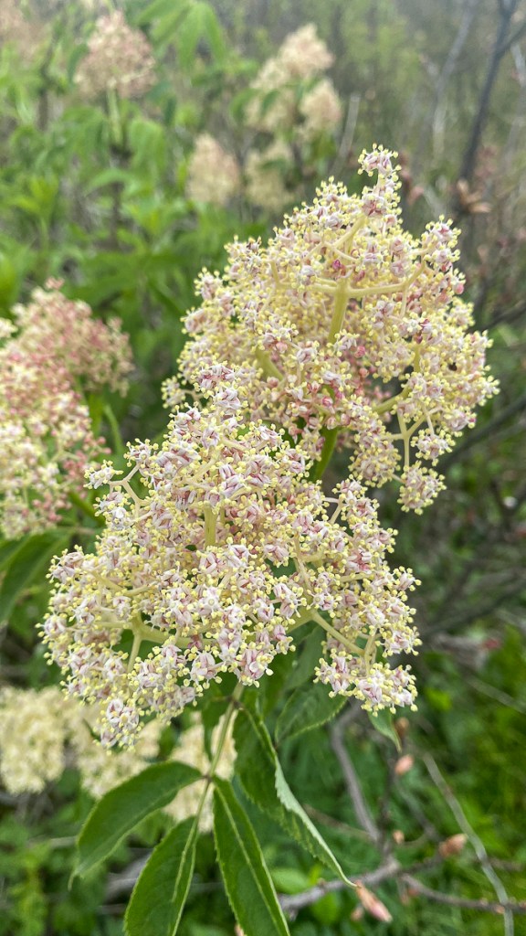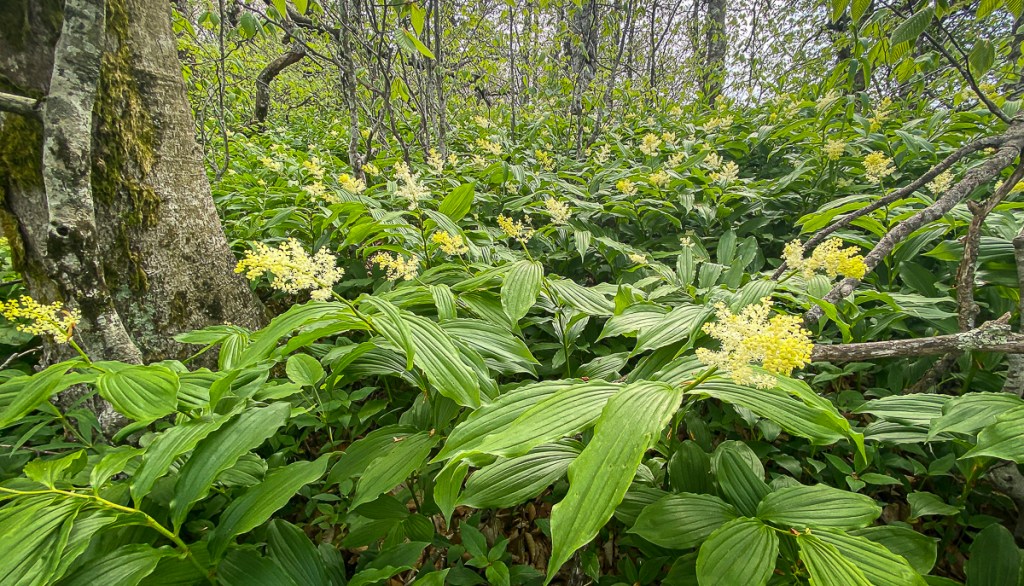 After our hike, we headed for our next overnight stay, the campground at Mount Mitchell State Park. Mount Mitchell, at 6,684 feet, is the highest point east of the Mississippi River. While temperatures reached an unseasonably warm 90˚ F at home during our travels, we wore our down coats on several days in these high mountains (just one of the many reasons I love it up here). We stopped at several overlooks on the parkway to take in the views and look at wildflowers. One spot had an incredible display of False Solomon’s Seal (aka Eastern Solomon’s-plume), Maianthemum racemosum. I’ve never seen such a solid stand of this plant!