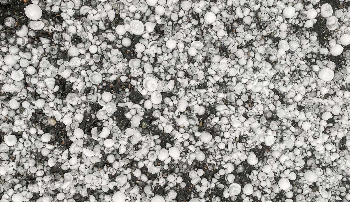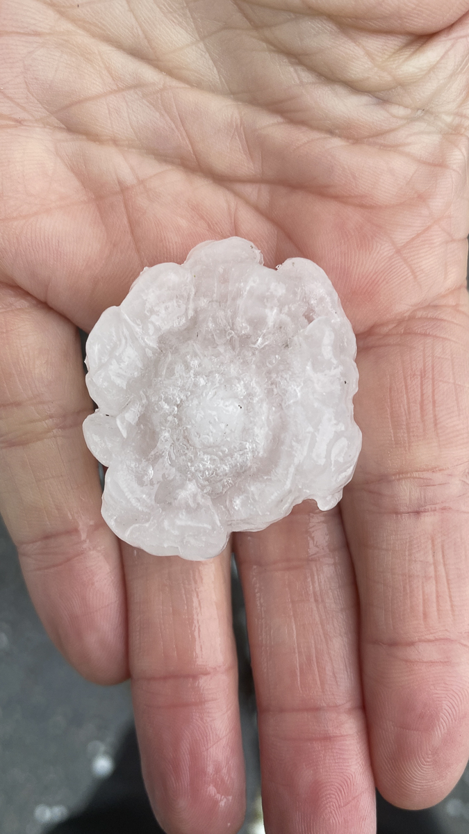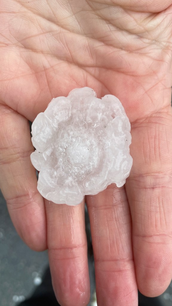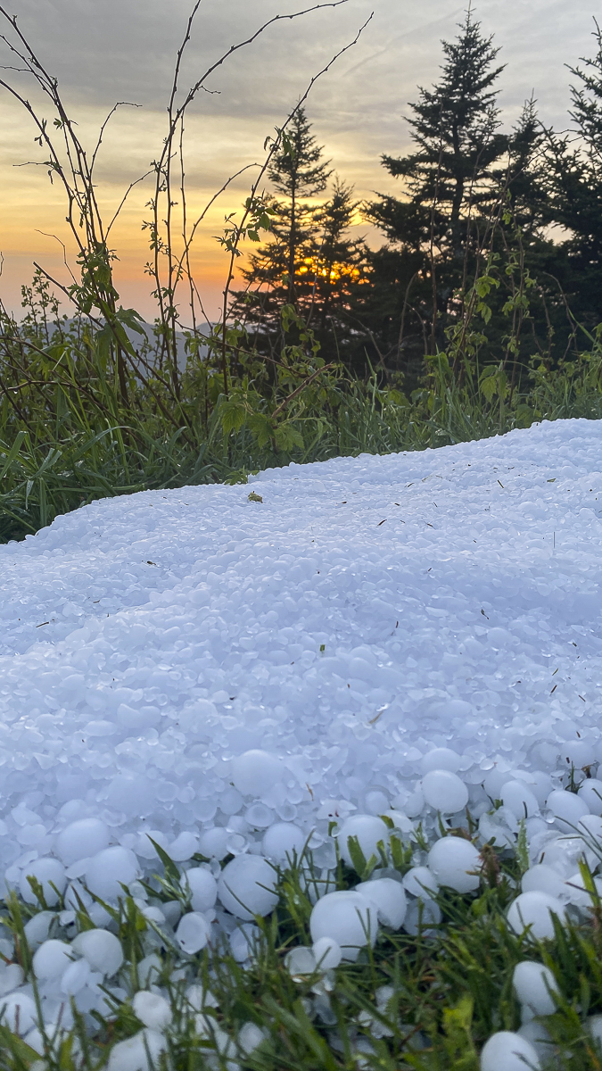 The hail storm lasted perhaps 20-30 minutes, definitely the worst such storm I have experienced. It ended abruptly with hints of sunlight streaming through breaks in the clouds. We got out and looked around in amazement – the parking lot was covered in hail of all sizes and it had been washed into piles by the heavy rain that accompanied it. One other thing stood out after the storm – the intense smell of fir needles in the air. The hail had stripped off countless branch tips of the trees and the air was heavy with that tantalizing smell!