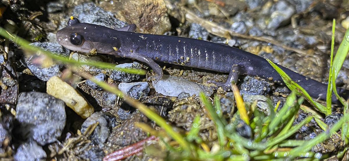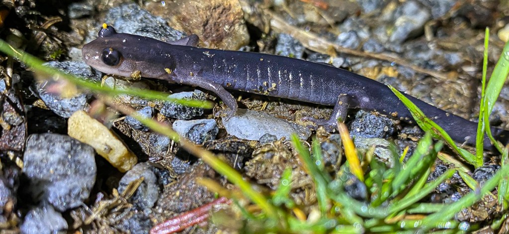 We were happy to see our tent had come through unscathed, although a little bit of rain had come in the vents which we had accidentally left open. Our truck fared pretty well but has a few tiny dents to remind us of the day (a smaller car parked next to us showed a much more dimpled surface). We tried to get a campfire started, but, as is almost always the case at Mt. Mitchell, the firewood up there seems to prefer to smoke rather than burn (I guess that comes with living in the clouds). We did have a welcome visitor at camp as we headed to bed – a beautiful Northern Gray-cheeked Salamander that emerged from a hole under our tent pad frame. More on our travels in the next post.