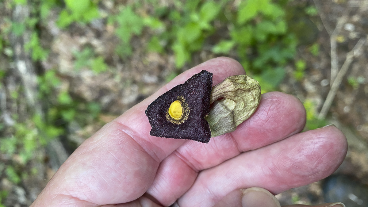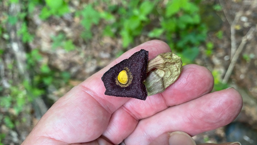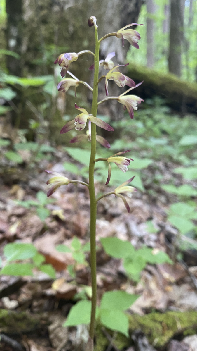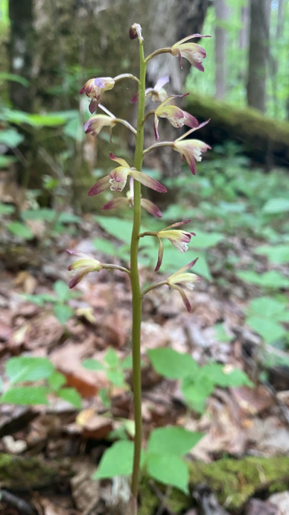 One species I was thrilled to find was Puttyroot. We have a few of these in our woods back home, but I have never seen it in bloom (they apparently don’t bloom every year if nutrient conditions are not sufficient). Like another orchid in our woods, Cranefly Orchid, this species’ leaves (or leaf in this case as each plant has only one) are only present in the late Fall – early Spring when the tree canopy is bare. The leaves wither before the plant sends up a flower stalk. A sticky substance can be obtained from the roots and has been used to repair pottery and even glaze windows, hence that common name. Another name for this orchid is Adam and Eve. That name refers to the way two adjoining corms are joined by a slender stalk of rhizome.