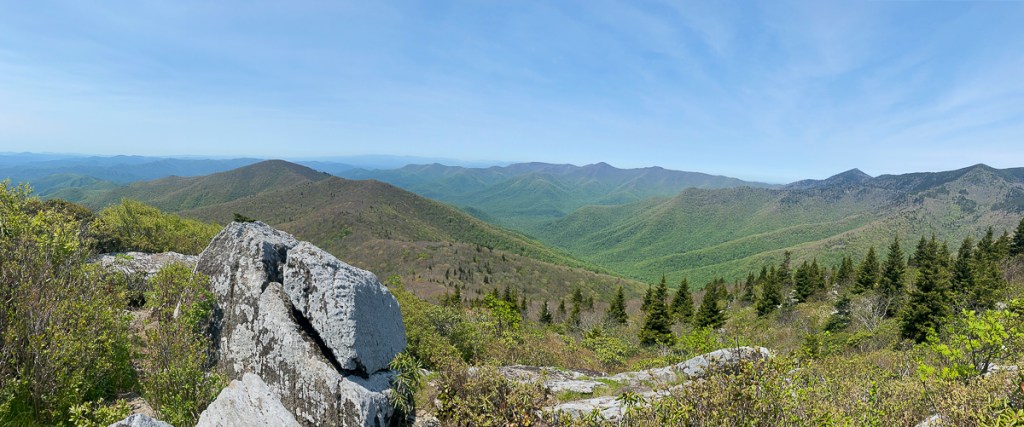 Our first afternoon we caught up with an old friend and former co-worker, Charlie, who now lives in Burnsville and has hiked every trail in that part of the state it seems. He gladly shared a couple of his favorite spots with us and so we headed up the Pinnacle Trail (aka, the Secret Trail) the next morning. It is just off the Blue Ridge Parkway near the entrance road to Mount Mitchell State Park. The trail slowly ascends through a beautiful woodland setting to a rock outcrop with a phenomenal vista of parts of the Black Mountain Range. Charlie told us he almost never sees anyone on this trail, hence the moniker of The Secret Trail. But, we had two group of hikers join us at the summit. When asked, they said they saw it on the All Trails app (secret no more I guess).