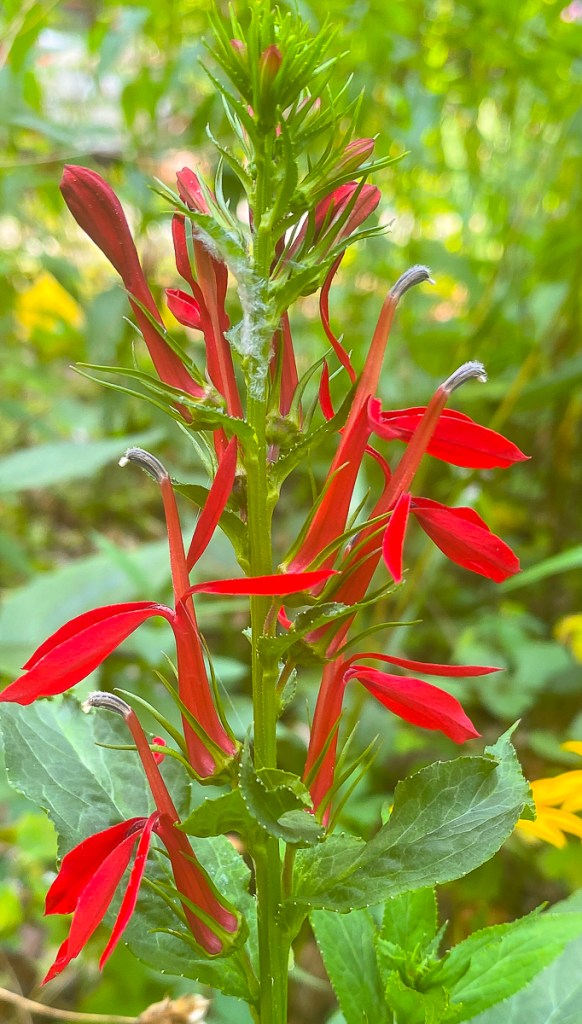 This is one of the few Cardinal Flowers that is not caged to protect it from the ravenous rabbit that unfortunately seems to prefer cutting this wildflower species over all the others in our yard. We’ll see how long it lasts.