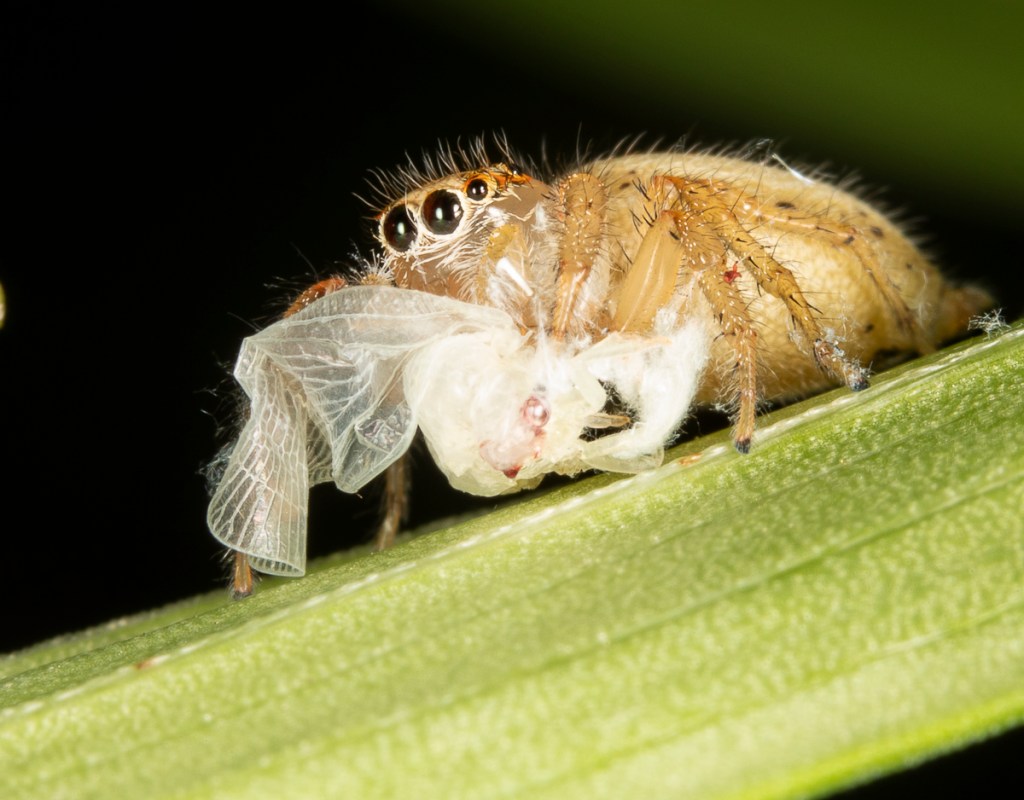 This small jumping spider grabbed a planthopper nymph off a Tiger Lily leaf and was taking a lunch break when I saw it.