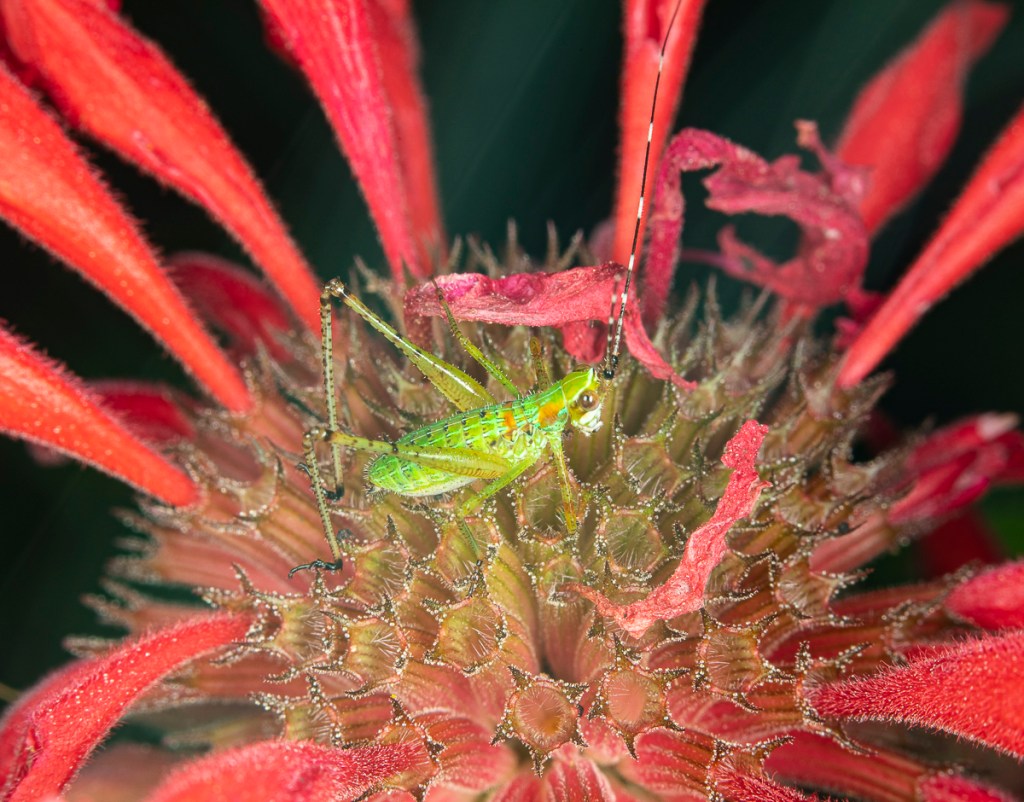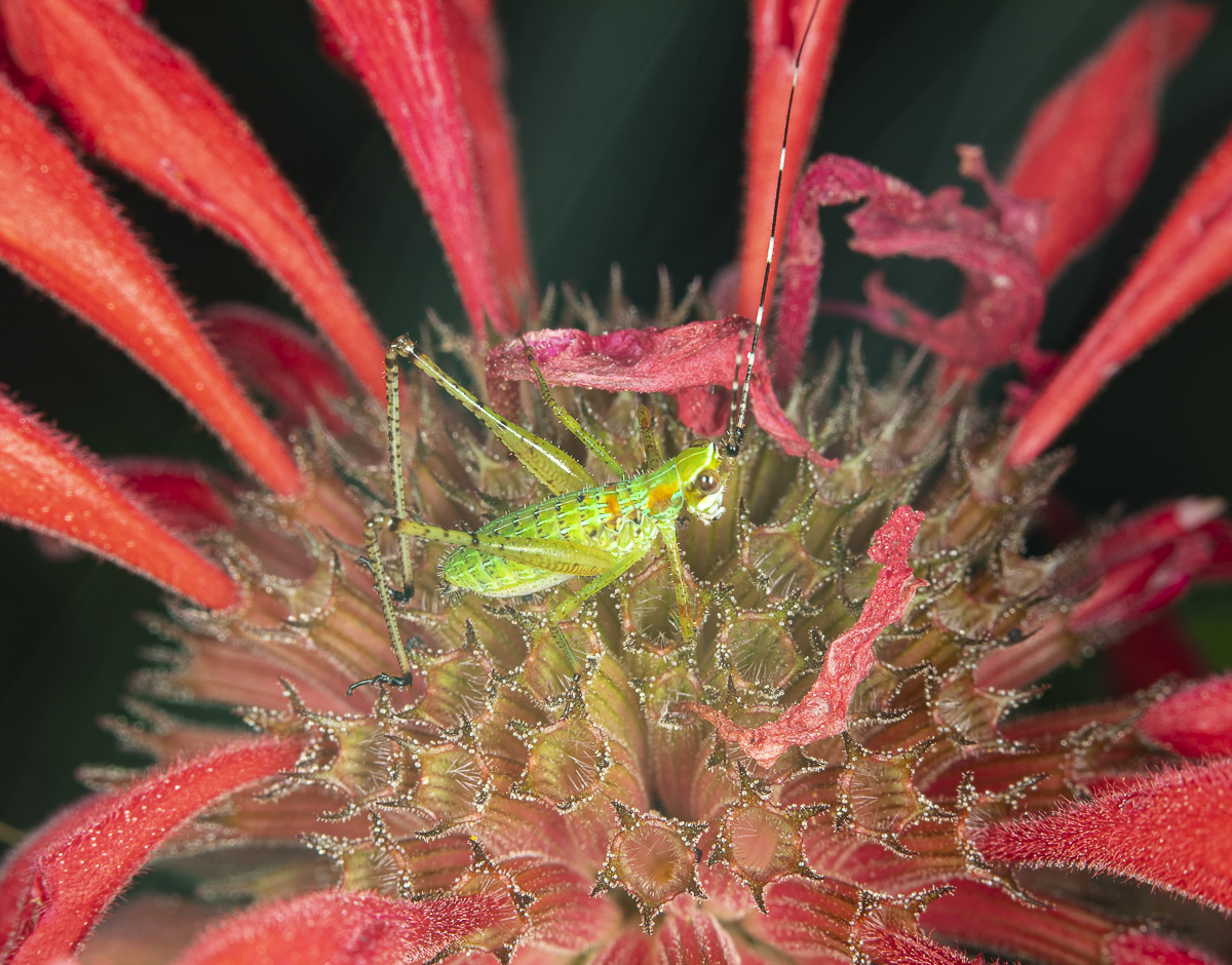 Scudder’s Bush Katydid nymph on Bee Balm. These little guys are all over the yard flowers now.