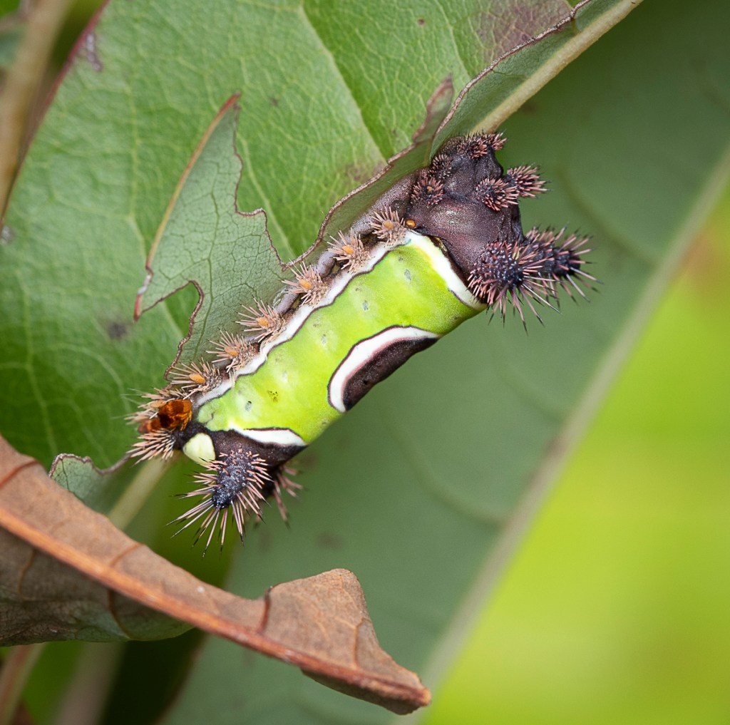 Our booth, Caterpillarology, was a tiny fraction of the hundreds of educational opportunities available at the museum’s annual BugFest event last weekend. This was the first time in a few years (that pandemic thing) that the museum has hosted a full scale BugFest and we were excited to participate once again. Staff and volunteers spent hours searching for, collecting, and then feeding over 50 species of local larvae to showcase at the event. Based on my cracking voice at the end of the day, I would say it was a huge success as we had a steady stream of visitors observing our caterpillars and asking questions for a solid seven hours. Though it doesn’t include all the species, here are photos of some of the stars of the show. Almost all have now been released back into the wild (we are raising a couple of species until they pupate to protect them from predation/parasitism and then will release that stage back into suitable habitat). Looking forward to next year’s event and what we may find.