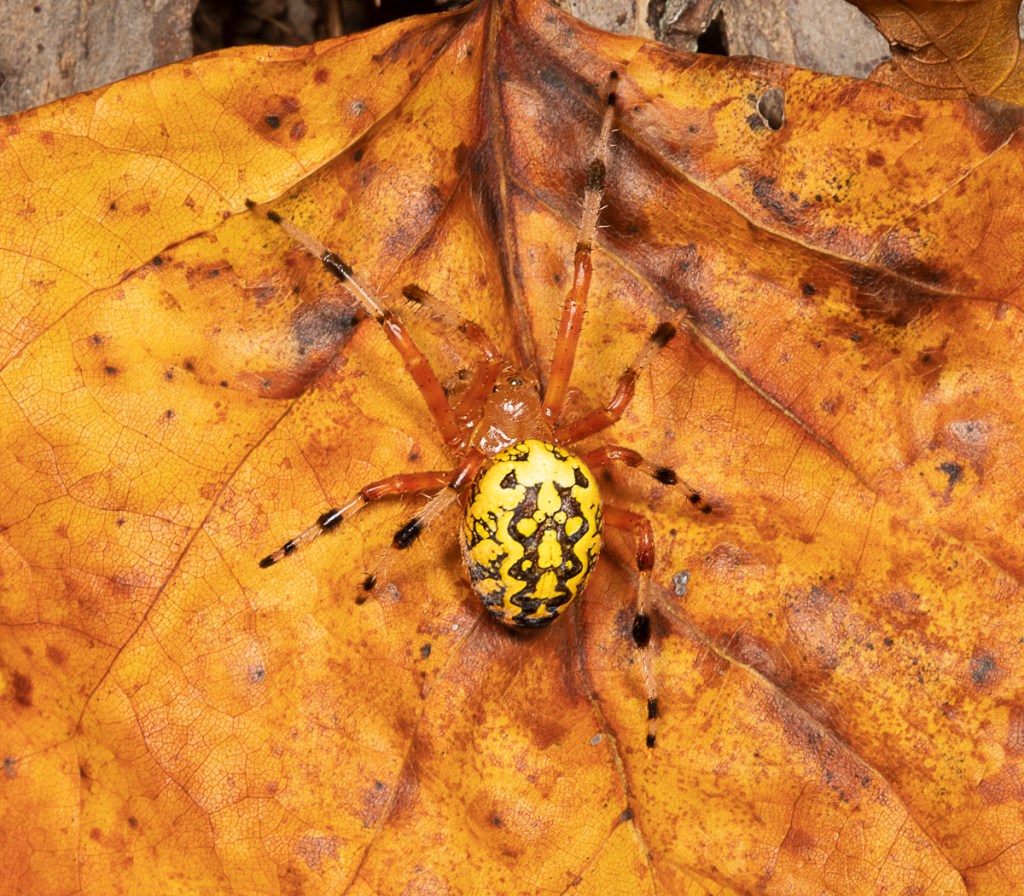 Walking a few feet more and I missed seeing another silken line and got entangled in a large web of another Halloween Spider. When I pulled on it to free myself, the owner dropped out of her hide onto the ground and scuttled away (a common defense strategy), but not before I managed a photo as she crossed an equally colorful fallen leaf.