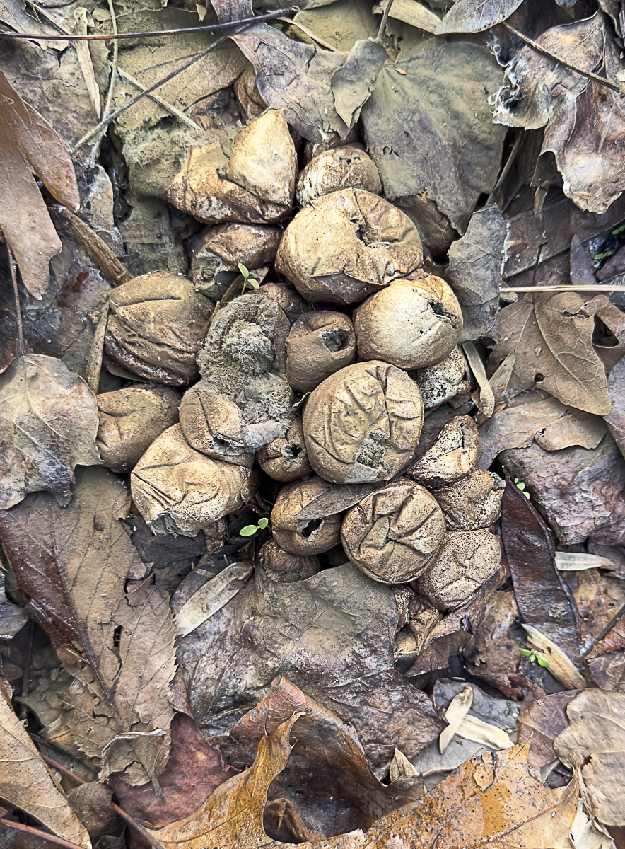 Thinking I might want to post this, I decided to learn more about these unusual fungi. When I put the photo in SEEK, the all-things-natural identification app, I loved the common name that came up – Wolf-fart Puffballs. Yep, that’s what I said, wolf fart. The scientific name is Lycoperdon pyriforme. It turns out the translation of that name defines the common name – “Lyco” means wolf in Greek; “perdon” means to break wind. Together, they mean wolf fart! People understand how the word fart came to be favored given the visible puff that comes up when one is touched, but why the association of wolves? Who knows. And “pyriforme” means pear-shaped referring to the shape of some of the structures.