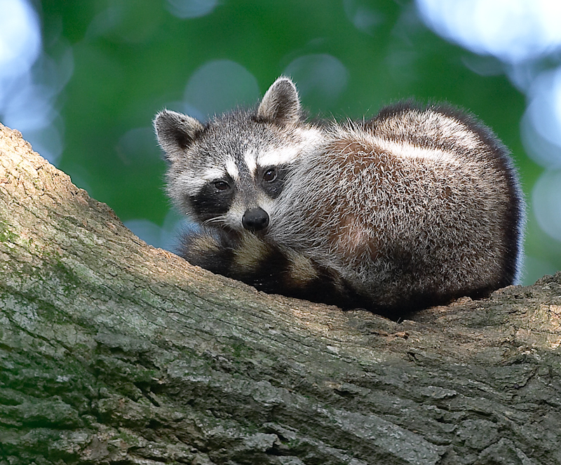 -A young Raccoon that was sleeping out on a limb one day several years ago checks me out when I went out into the yard for a photograph. When I went back inside, it curled back up and went back to sleep.
