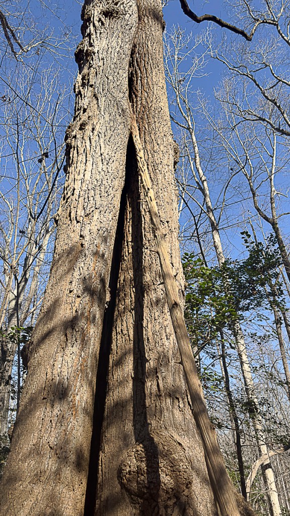 A large split at the base provides access to hollow spaces within this tree. But the Raccoons that use itr as a den tree climb higher and squeeze through a relatively small hole about 30 feet up the trunk